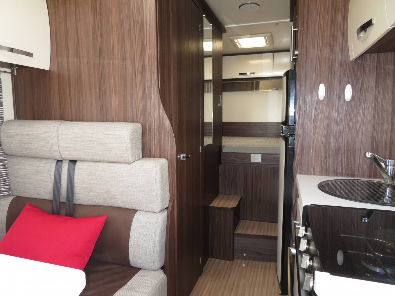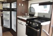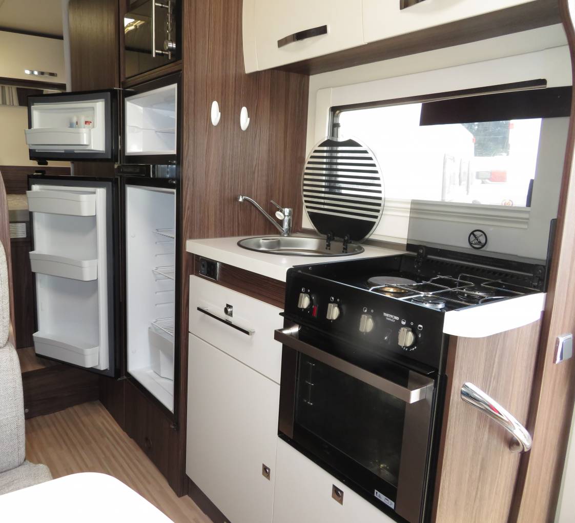 The main living area is in lovely condition and has a wonderful stylish look and feel. At the front there is a double dinette seating area with a further single side facing seat. There is also a removable dinette table that is the ideal place to enjoy and meal, snack or even just a nice refreshing drink of choice whilst browsing and laptop or tablet. Moving back there is a very well equipped kitchen featuring an oven, grill, hob with 3 gas burners, microwave oven, sink with mixer tap and large fridge with separate freezer.