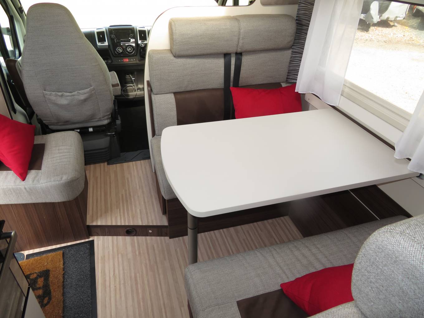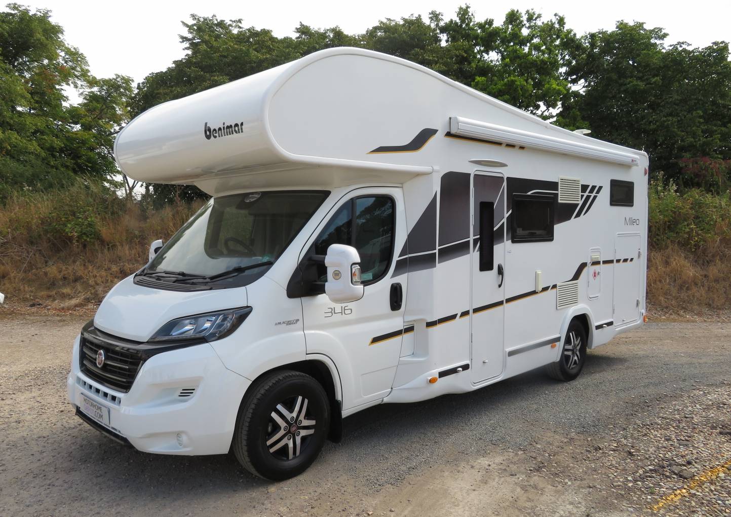 The Benimar Mileo 346 is a fantastic 6 berth motorhome with 6 travelling seat belts. Benimar is a Spanish built motorhome that is become well known in the UK market for is stylish designs and excellent build quality. This motorhome is no exception and is the perfect motorhome for a family looking to spend time away together or even for a couple looking to enjoy more space whilst away. It has a brilliant layout with the main features including and extremely comfortable large fixed transverse bed at the rear, large garage, well equipped kitchen and good sized washroom.