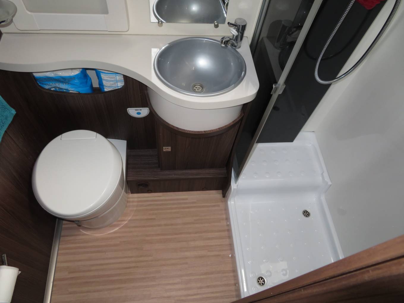 The Benimar Mileo 346 is an exceptionally comfortable motorhome to sleep in. It has a large double fixed transverse bed at the rear, another very large double over cab bed and a further smaller double that can be made up for the dinette seating. It also has a good sized washroom featuring a Thetford flush cassette toilet, sink and separate shower. The motorhome has heating and hotwater provided by the extremely easy to use Truma Inet system.