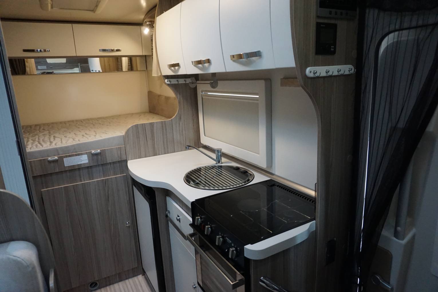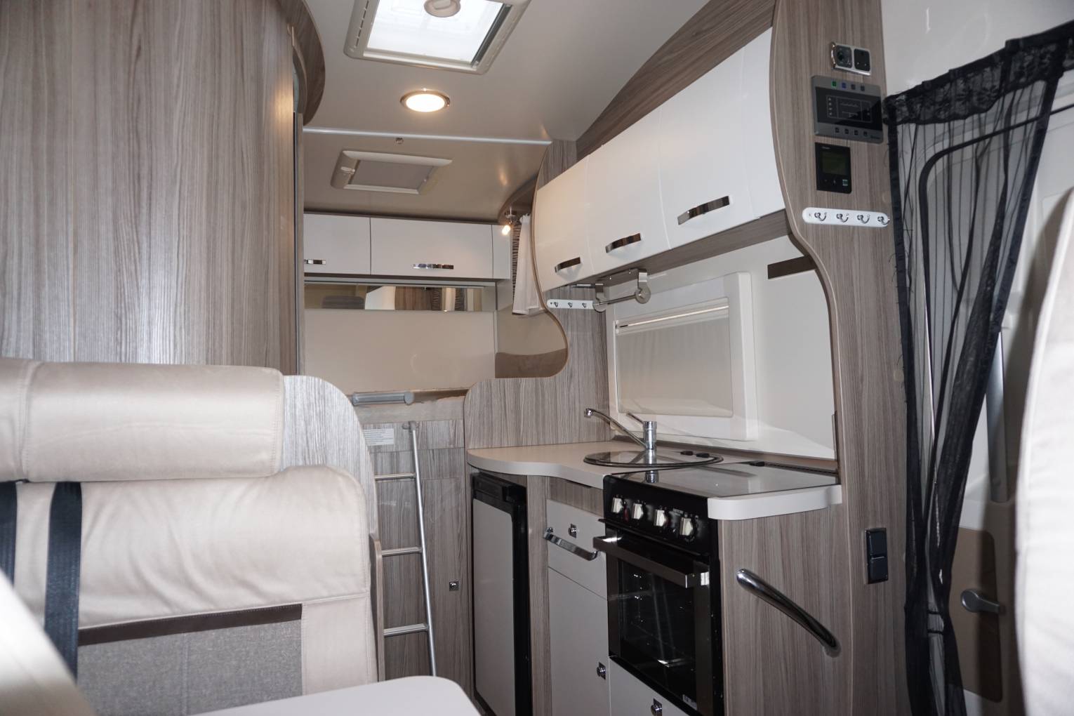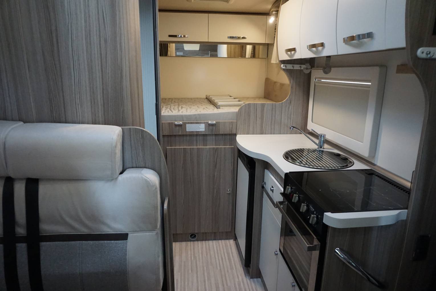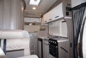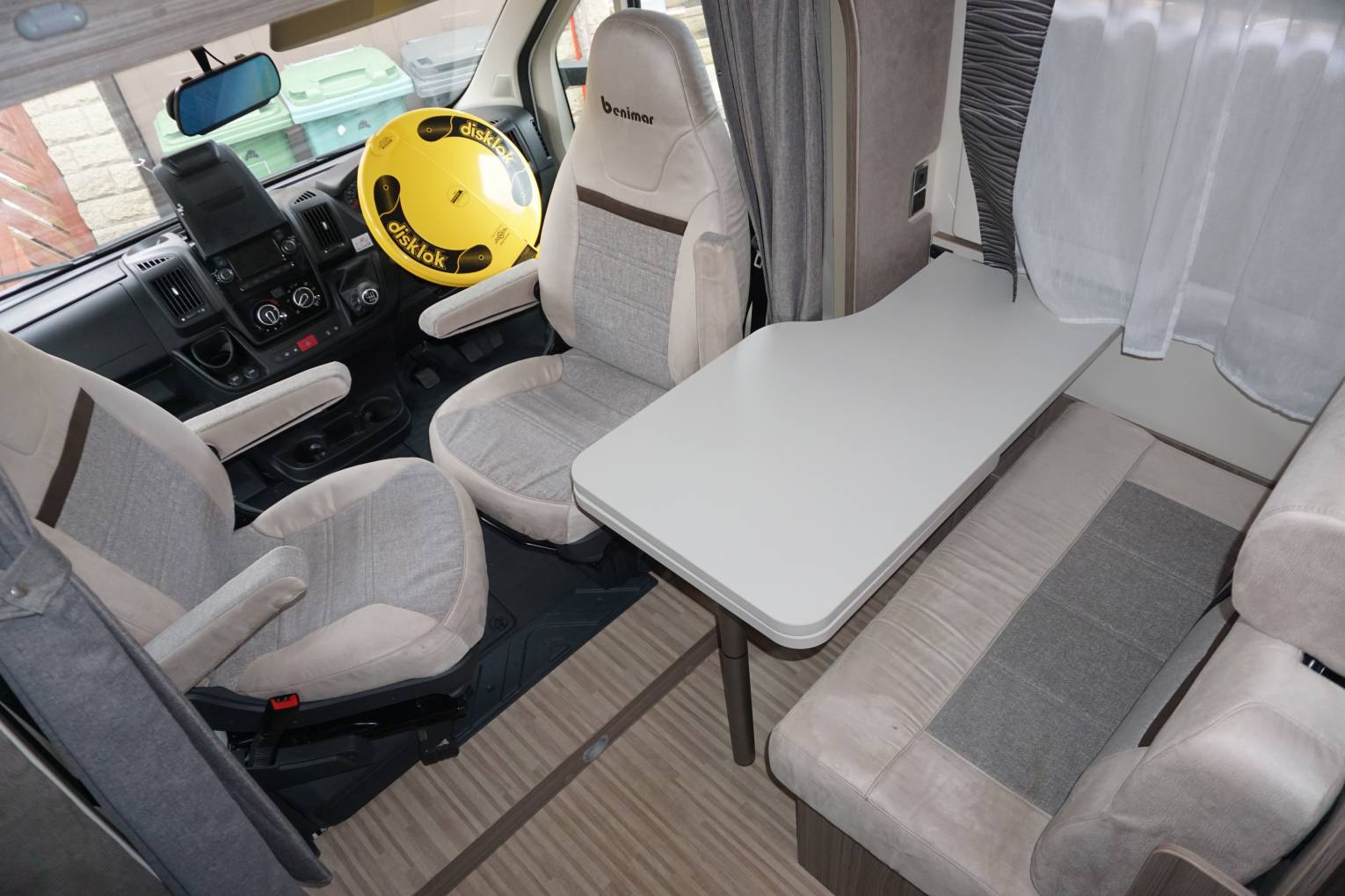 Motorhome Depot have the pleasure of presenting this Benimar Primero 301 4 Berth family Motorhome. As we enter the motorhome you are faced with the lounge area. To make the lounge, the two cab seats (both with Benimar covers) swivel to face two forward-facing travel seats across a long pedestal table. This has an extension, so there is room for four here. A rooflight and large window let in plenty of daylight, while a large LED in the ceiling lights things up at night. There is one mains socket for the lounge high up by the door, and this comes with a TV and 12V socket.