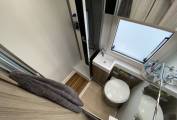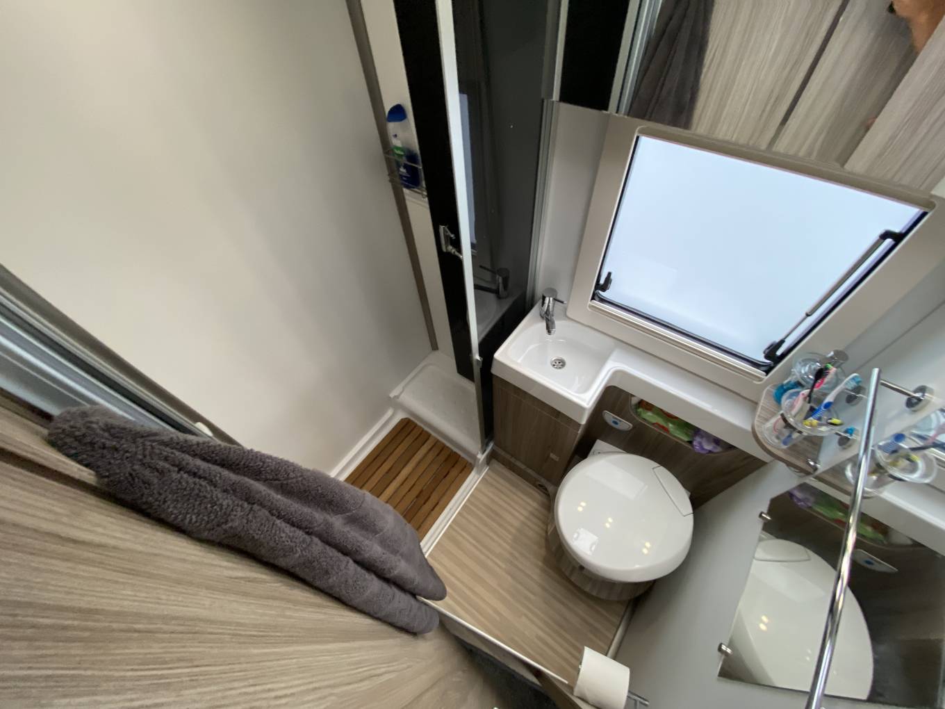 Opposite the kitchen is the bathroom where you will find a Thetford Cassette Toilet, a Wash Handbasin and a shower cubicle that divides off.