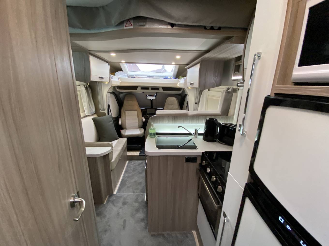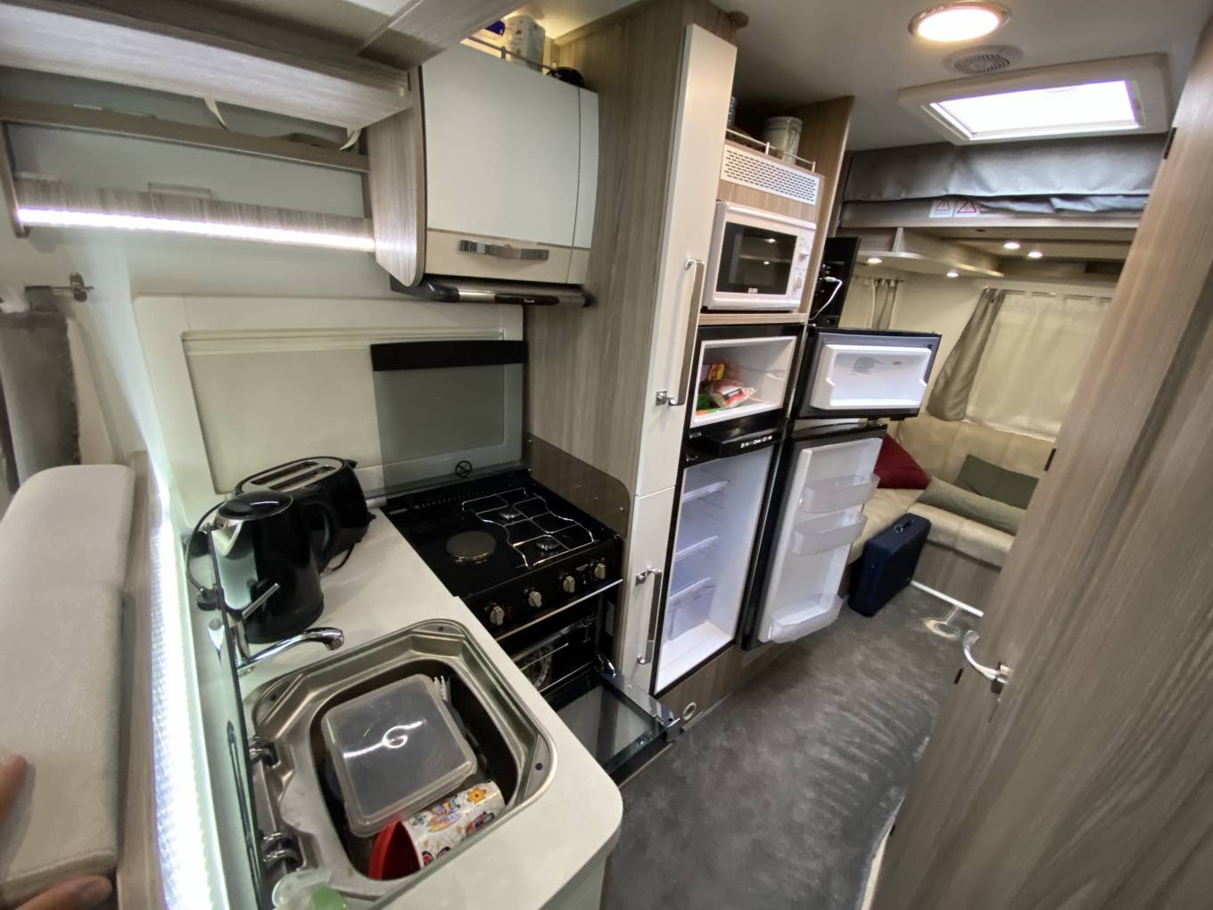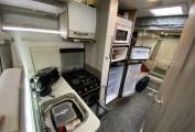 Directly to the rear of the belted seats is the comprehensively equipped kitchen consisting of a two gas burner and one electric hotplate hob, a combined oven and grill, a large three energy source Fridge with a Separate Freezer, a Microwave Oven, an Extractor fan, a sink with hot and cold water supply, worktop area and plenty of cupboard space.