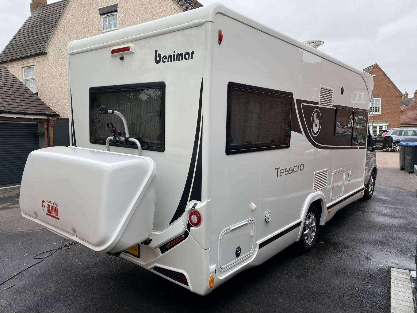 Outside A Fiamma Awning, a TV Aerial and a Bike Rack have been fitted as well as a storage box that fits on the rack.