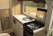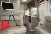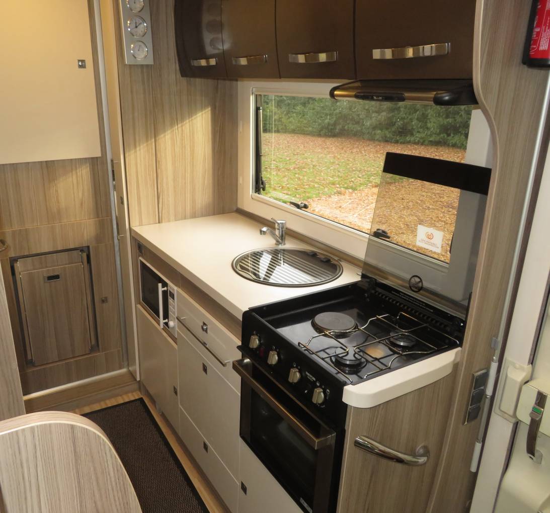 The living area is great on the 486 and has an extremely spacious front lounge, making use of the two Captains chairs, a long L-shaped sofa and a further side sofa. This is a fantastic place to put your feet up and relax and enjoy a good book or watch the TV. The motorhome also comes with a central table that can be set up for mealtimes or stored away in the garage when not in use. Moving back you have an extremely well equipped kitchen area that features an oven, grill, duel fuel hob with 2 gas burners and an electric hotplate, microwave oven, sink with mixer tap and large 3-way fridge with ice compartment.