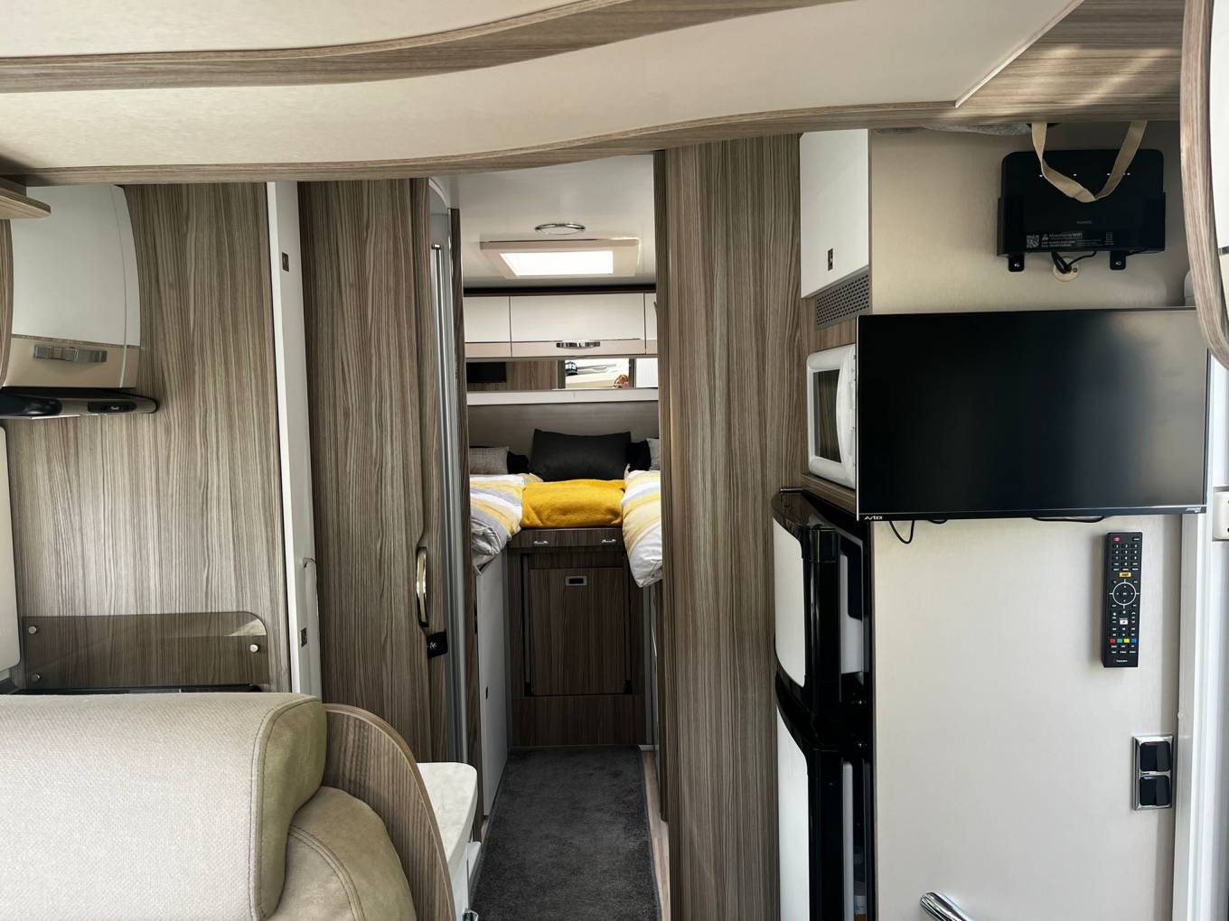 Huawei Wifi, TV, Tracker, Alarm External BBQ point, Spare wheel, Tow bar, Alloy wheels, Hook up lead and a full fold down windscreen cover.