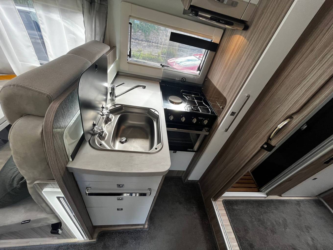 is also a drop-down double bed above the dining room/lounge area for two more,