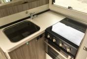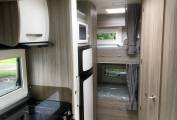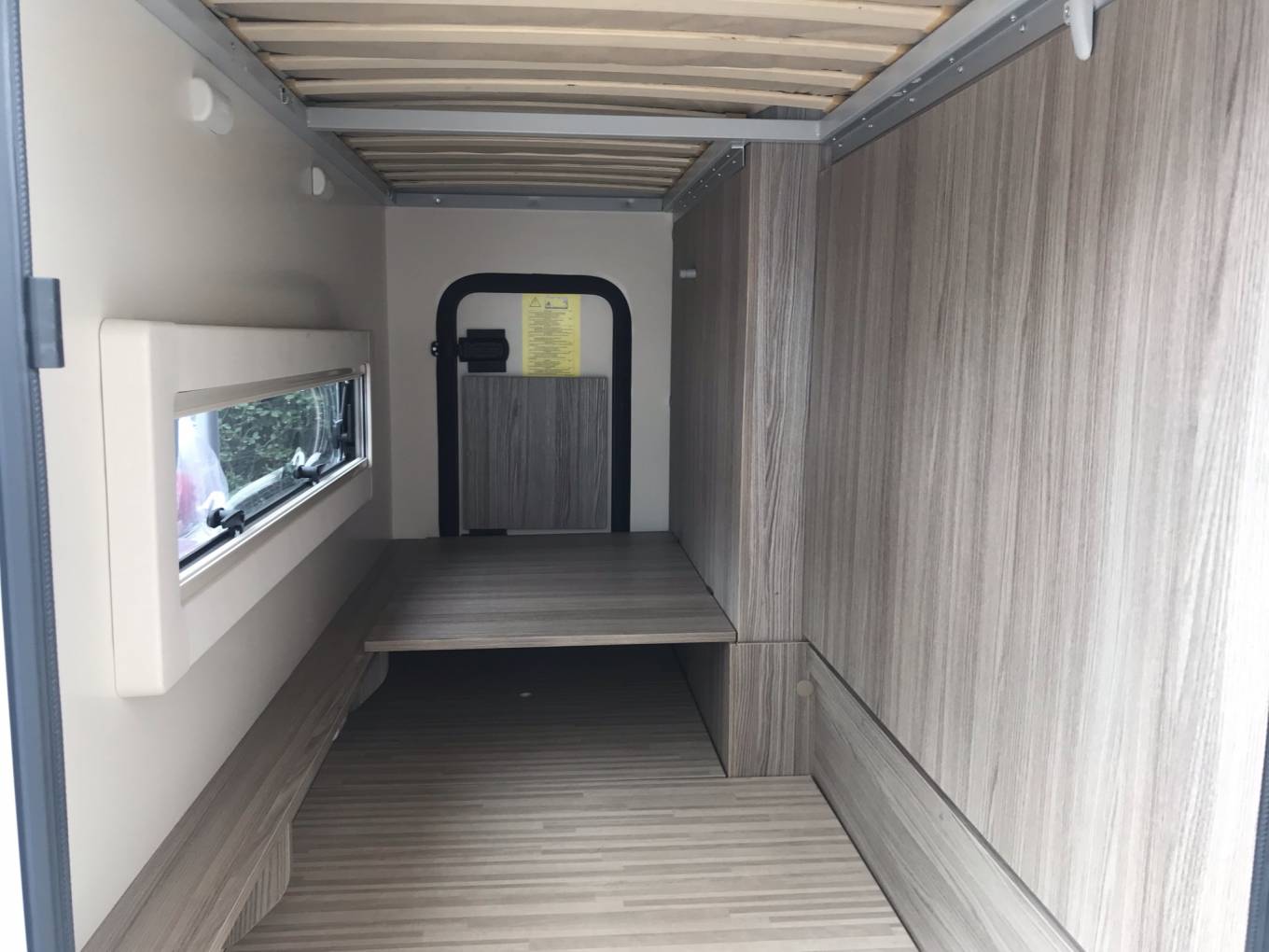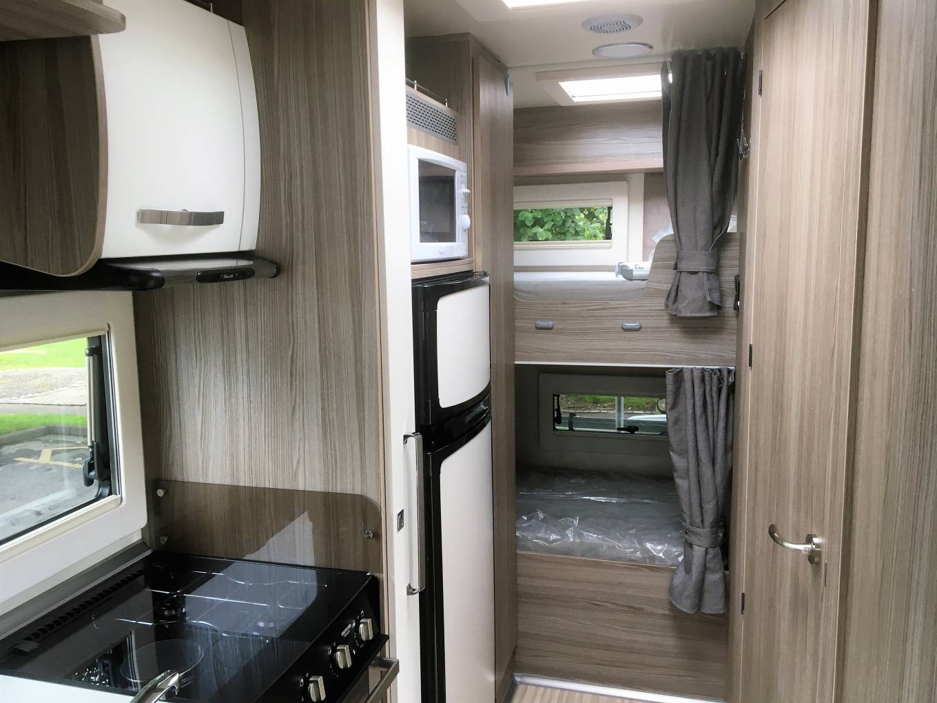 The spacious rear adult-sized bunks are situated to the rear and the lower bunk gives space for larger items such as bikes and chairs. The additional drop-down over lounge bed offers two further comfortable sleeping spaces.