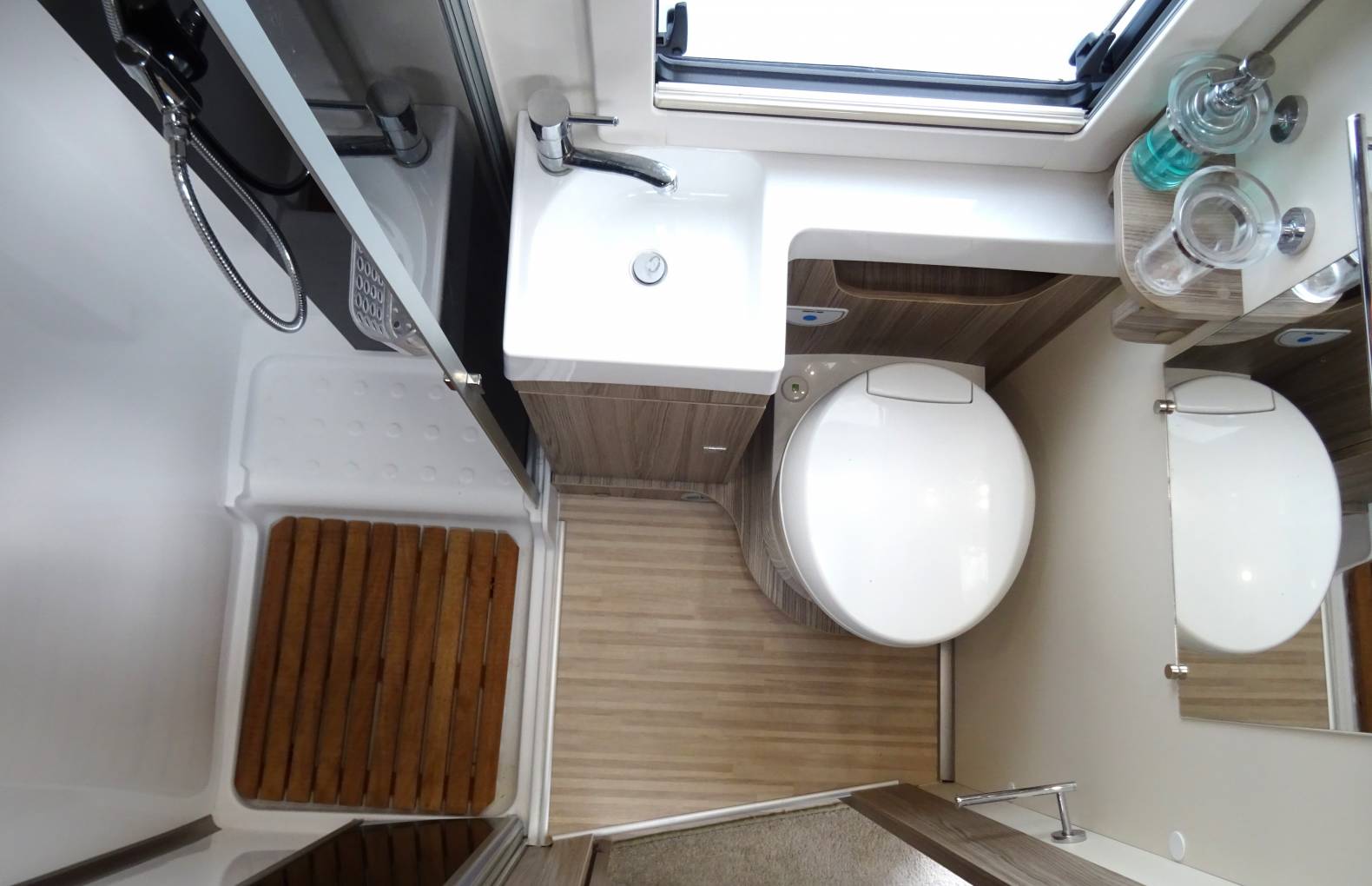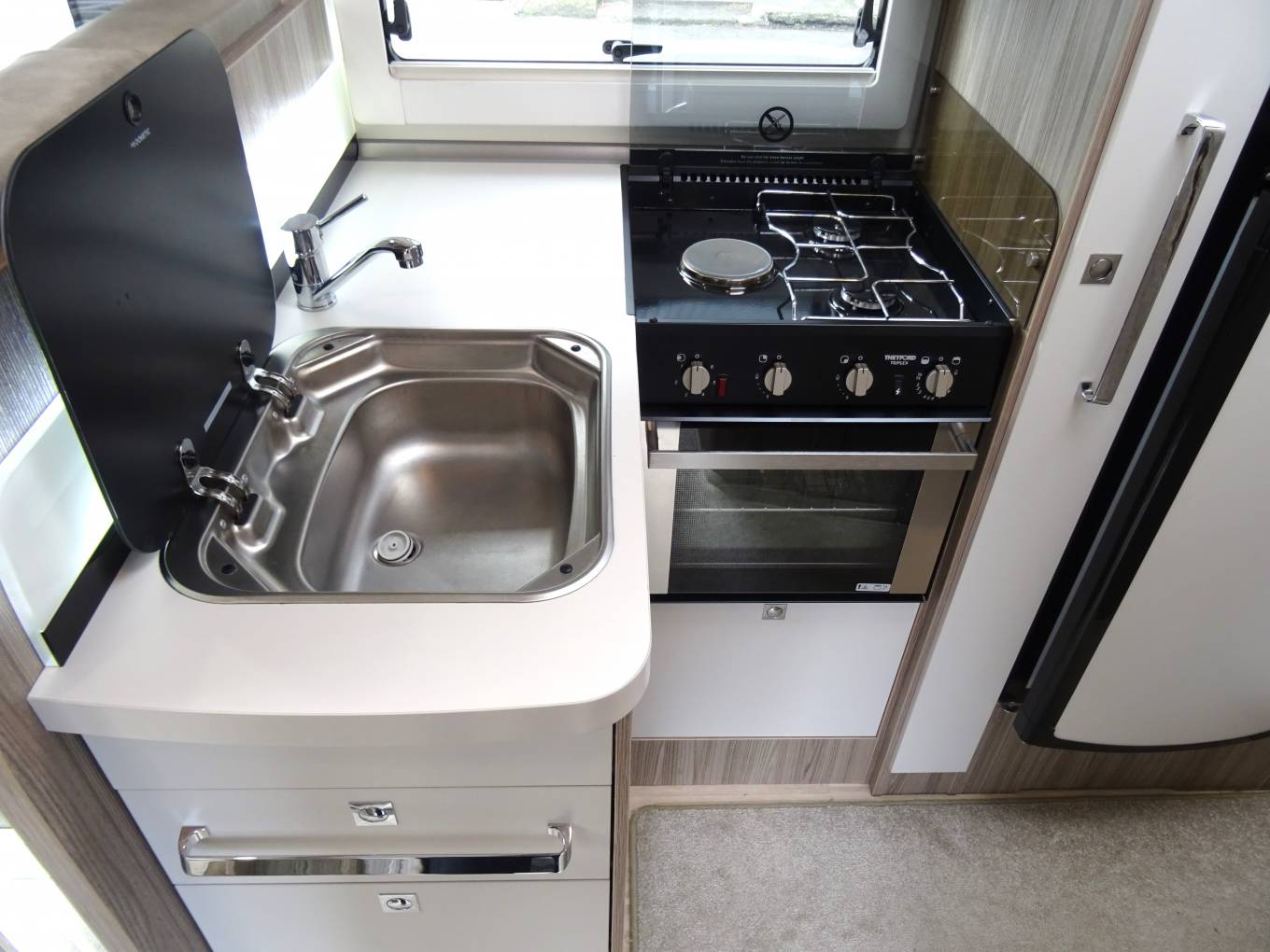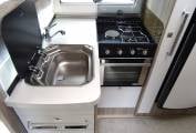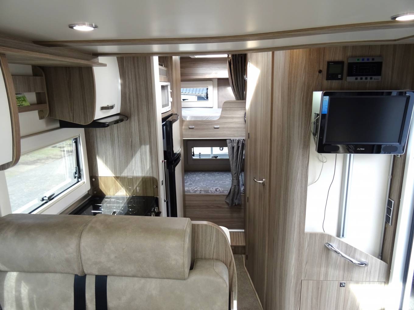 The spacious rear adult-sized bunks are situated to the rear and the lower bunk gives space for larger items such as bikes and chairs. The additional drop-down over lounge bed offers two further comfortable sleeping spaces.