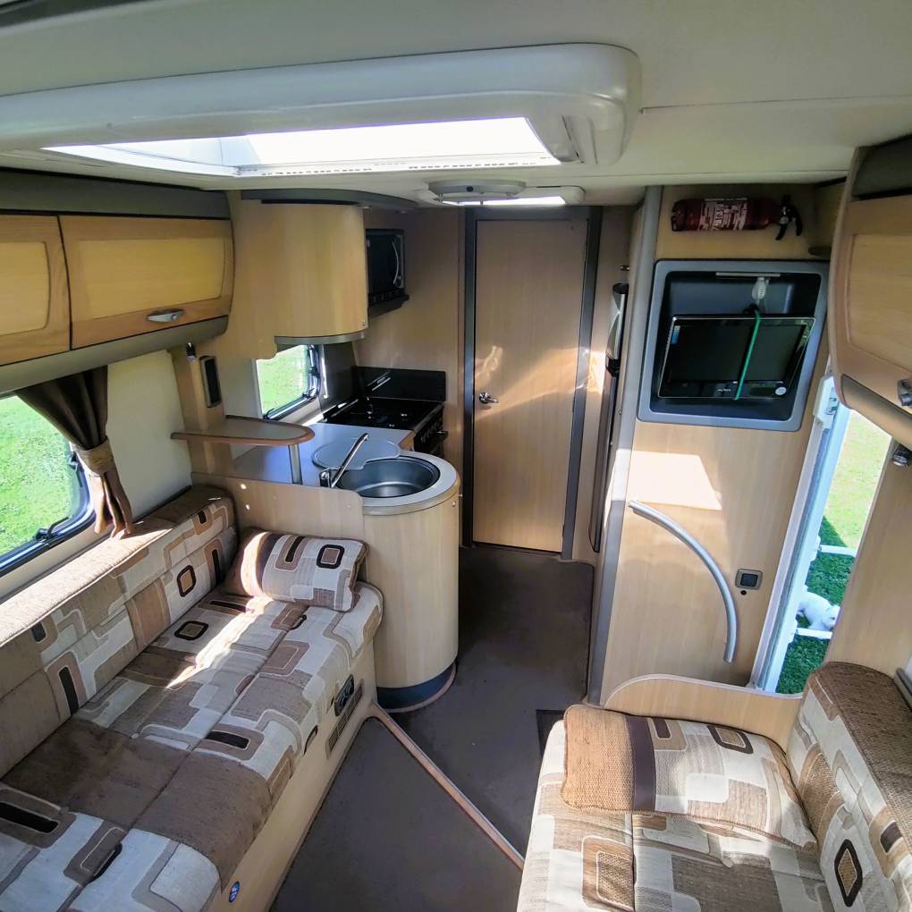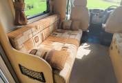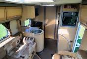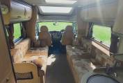 This motorhome offers outstanding social and sleeping space. The cab seats swivel, there is one 2, and one three seat sofas.