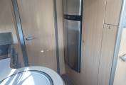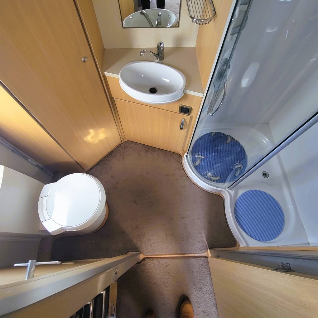 The ace feature is arguably the full width washroom with one of the largest shower enclosures of any motorhome with still ample space for a wash basin, and swivel pedestal loo, and a very large shelved storage cupboard.