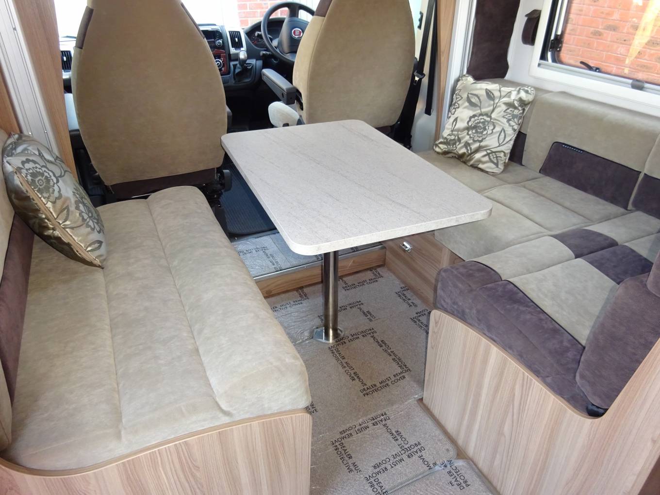 hob with electric hot plate. Above the cooker is a built-in microwave with digital controls. The sink is a granite-look GRP which has a removable drainer. A chrome effect mixer tap and acrylic splash back with LED lighting completes the modern look. On the other side we have the 138 litre Dometic slimline fridge which has a removable freezer compartment. Next to the fridge is a slim wardrobe with hanging space and this is where the directional TV aerial is. As we move to the living area the carpets are worth mentioning having not been used, hence the plastic covers. So for seating and dining the column mounted table can be used porttait or landscape so to speak. For socialisiing with both front seat swiveled to face the lounge 5 or 6 people can sit around the table in comfort. To travel, a spacer cushion comes out in front of the forward facing sofawhich houses two 3 point set belts. A TV mounting bracket if fitted above this sofa. With the table stored the front double is made by sliding out a slat support, rearranging the cushions and you have a double of 7'0" x 4'11"/3'5". Next we have the drop down bed, 6'2" x 4'1". Electricaly operated it has 3 positions. This give the flexibilty of a fixed bed in that the made bed can be raised to store or travel. The real clever part is that it can be used with the ladder access in a high position above the front double or with sofa cushions removed it lowers to an easy to get into height just above the sofa seats. The interior is very smart and modern being very clean and tidy throughout.