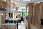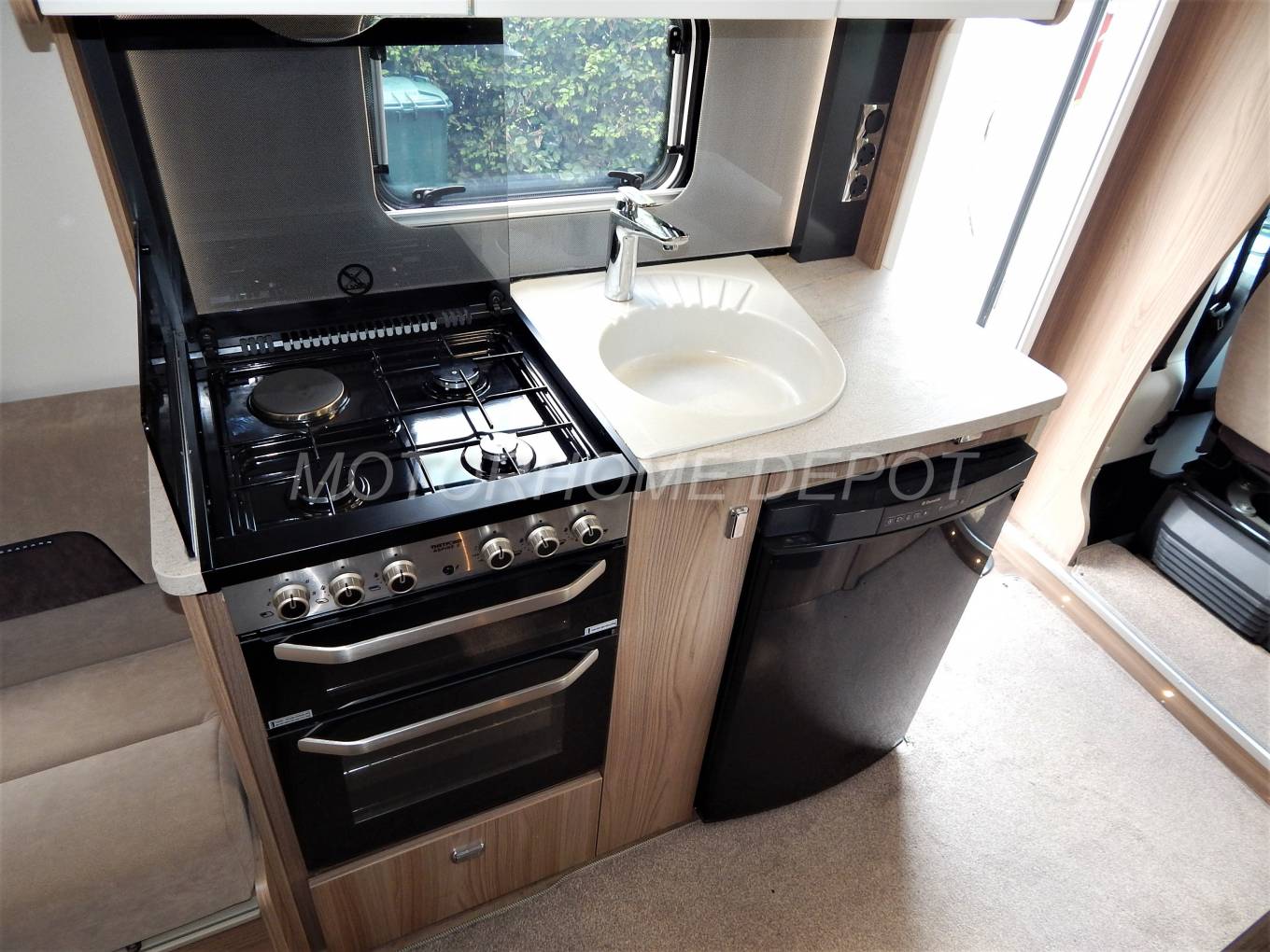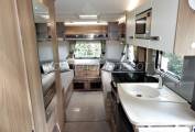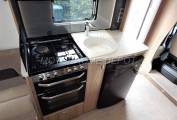 Opposite is the galley kitchen which consists of: an extendable worksurface; full size oven and grill with a 4 burner multi fuel hob, 3 gas and one 240v hotplate for use on site; single sink with chrome mixer tap and detachable drainer. Below the surface is a good size Dometic absorber style fridge freezer, this is fully automatic and can be powered by 240v, 12v or gas depending if you plugged in on site or wild camping. There is plenty of storage cupboards above and below and a Microwave oven for use on site.