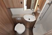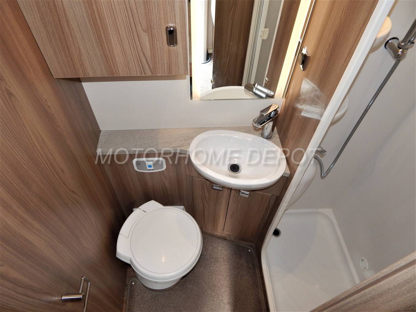 We enter the motorhome on the passenger side immediately ahead is the all in one bathroom which has a separate shower with Perspex doors to close a chrome mixer tap and shower head on a chrome riser. The toilet is a Thetford cassette style with a swivel head and fresh water flush. There is a white bowl shaped sink ilt into a vanity unit with a chrome mixer tap.