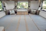 Moving rear is the spacious rear lounge, this vehicle has had the addition of a central rear storage unit which also makes an occasional table with a folding leaf on the top. There is a folding dining table which could easily seat 6 around if entertaining on site. At night this area makes up into either a large double bed or two singles using the cushions to make up the mattress. There is a TV point on the wardrobe wall with a flat screen Avtex TV.