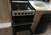 The well-equipped and practical kitchen unit contains Thetford’s latest Aspire cooker, with three gas burners and a mains electric hotplate under a glass lid, and a separate grill and oven below, plus a pan cupboard. To its right, the large round composite sink has a small integral draining area and external mixer tap, plus a chopping board lid and separate plastic draining tray. The work surface alongside (with two wall-mounted mains sockets behind) is extendable by a lift-up flap.