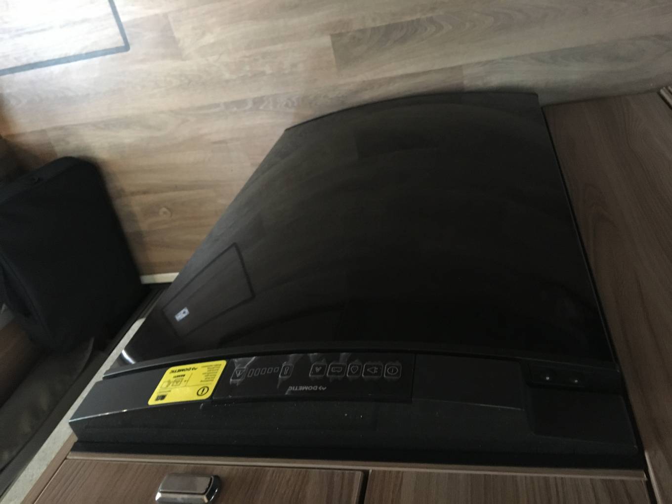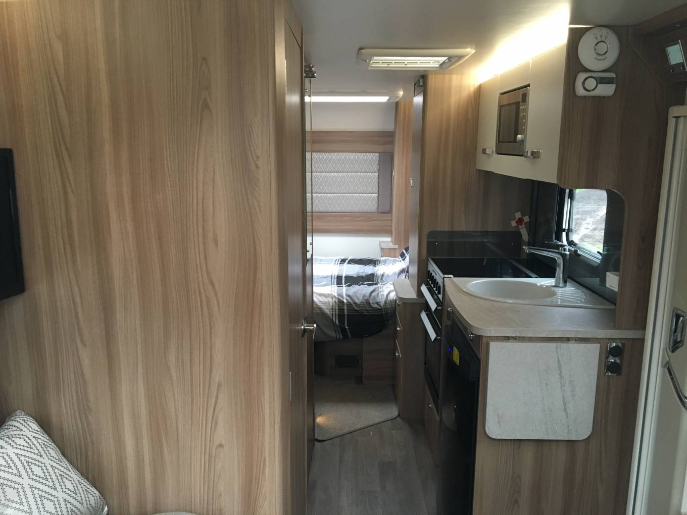 There’s an easily-accessible microwave above the sink and the 110-litre Dometic AES fridge – with removable freezer compartment – lives below.