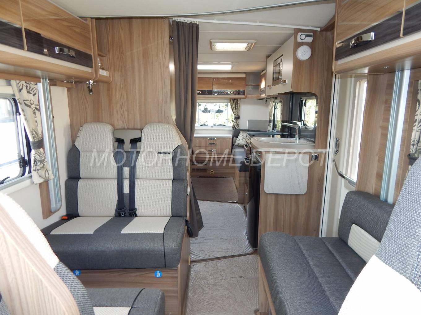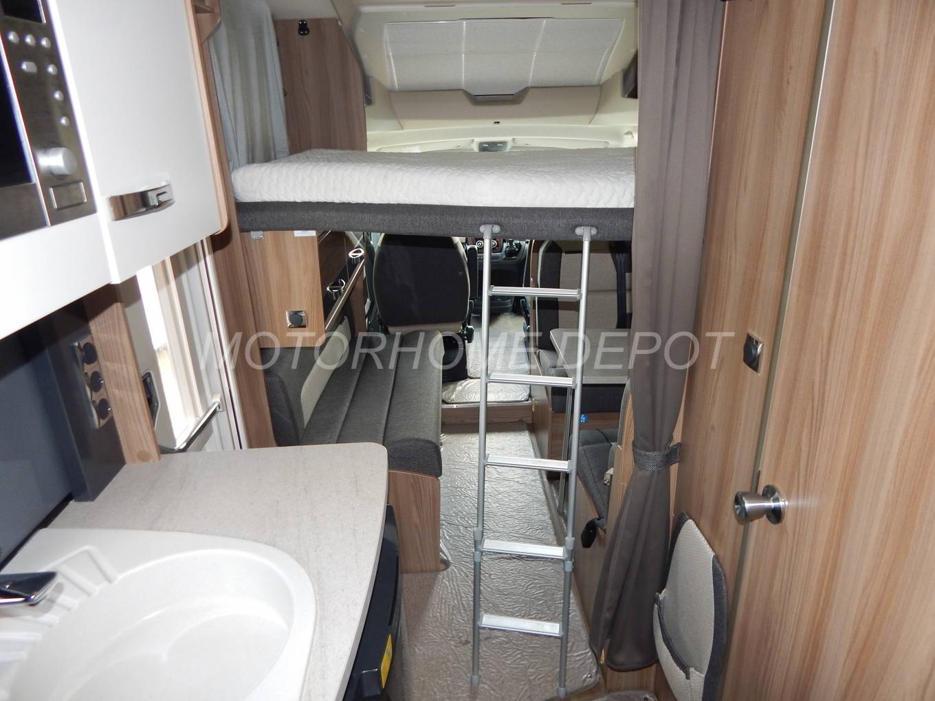 Step inside this luxurious motorhome and the front lounge/dining area is to your left with a side sofa & two forward facing seats plus two rear facing seats, all with 3-point seat belts making this an ideal family motorhome. This area makes up into a large double bed, plus there is an electric drop down bed which has an aluminium access ladder.