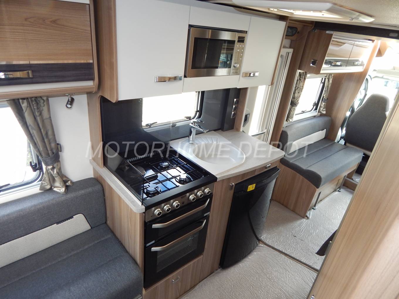 The kitchen is well specified with a large round designer style sink and chrome mixer tap, a dual fuel hob with 3 gas burners and an electric hotplate, gas grill and oven beneath, a Dometic 3-way powered fridge with freezer box, a built-in stainless steel microwave oven, a pop-up additional counter space plus plenty of cabinets and cupboards to store away your holiday provisions.