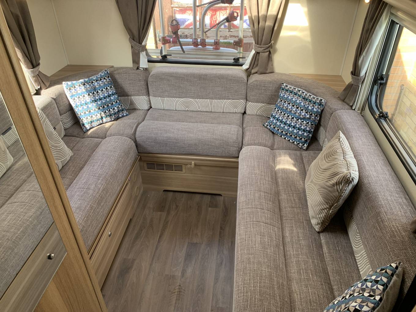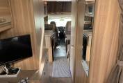 As you enter the motorhome you have the highly desired rear lounge layout featuring a U shaped sofas, TV, Ariel and plenty of overhead storage. The rear lounge is flooded with lots of natural light thanks to the large rear and side windows and roof light.