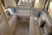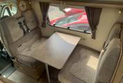 Opposite the kitchen is incredibly spacious central dinette which is a fabulous spot to relax and unwind in. There is a forward facing 2 seater sofa with 2 seat belts and a rear facing 2 seater sofa fitted with a further 2 seatbelts along with a large dining table in between. Above the cab is the third large double bed which is easily big enough for 2 tall adults..