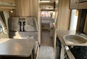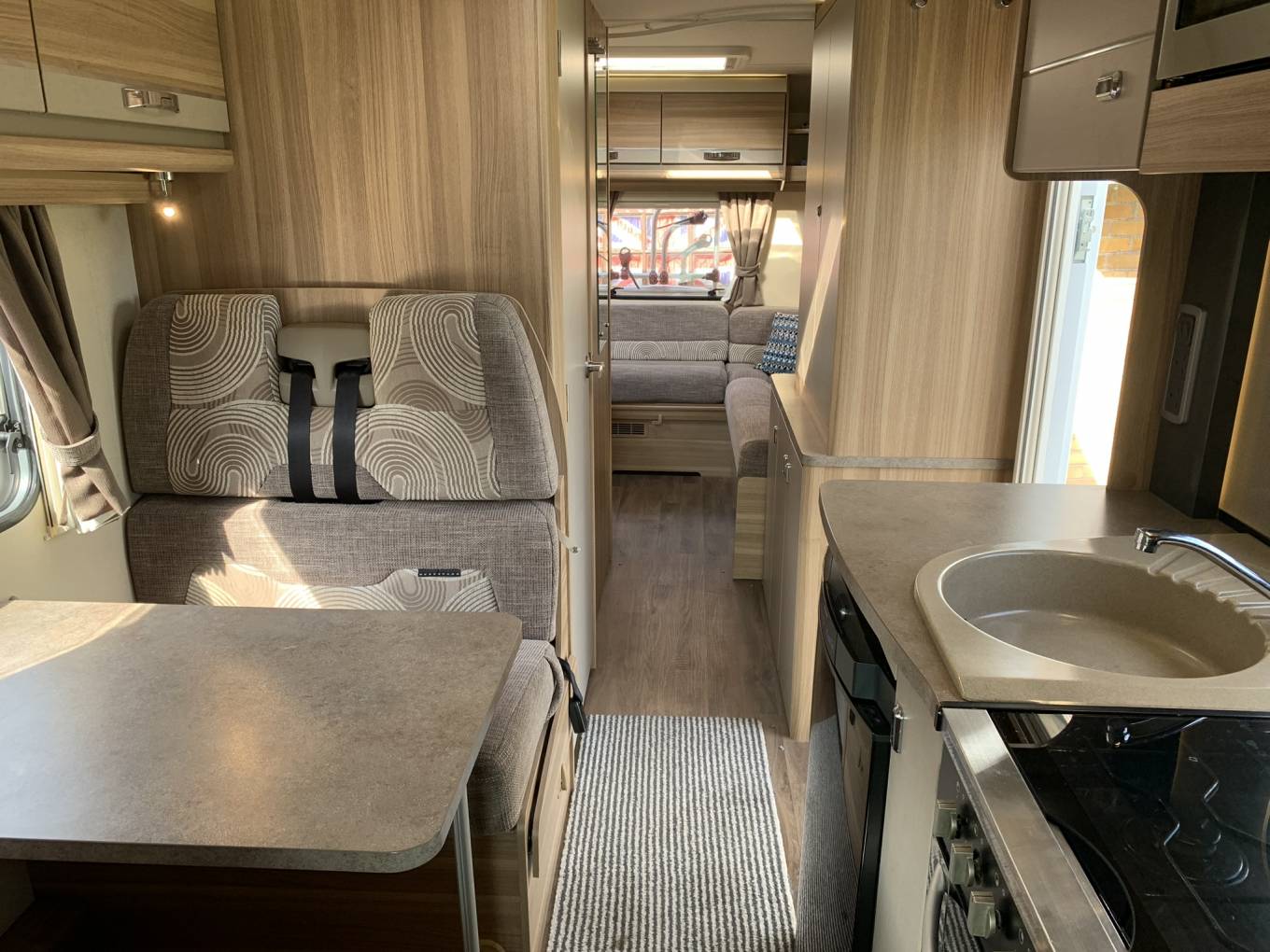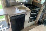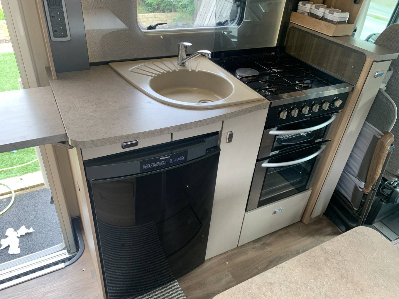 Carrying on through, you come to the kitchen which has everything you need to rustle up a lovely meal. There is a 3 gas ring/1 electric burner hob, a Thetford oven with grill, a large Dometic 3 way fridge freezer, a sink with mixer tap, a microwave and lots of storage space for utensils and ingredients plus a good work top area.