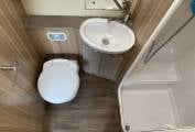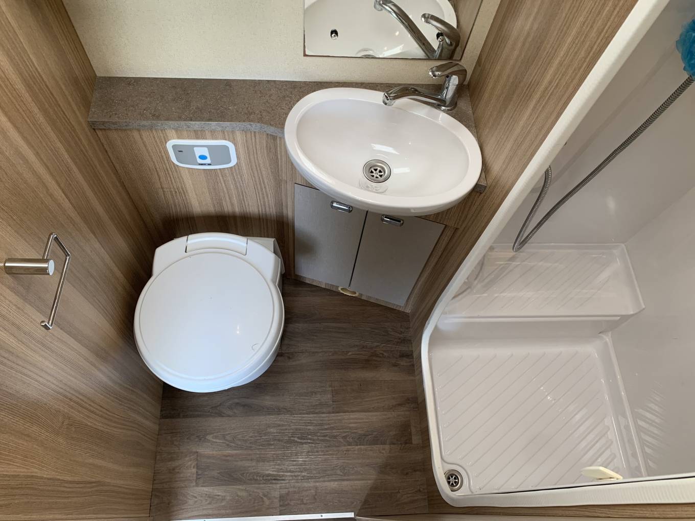 As we move through the motorhome, you have the popular large washroom which consists of a full length separate shower, Thetford Toilet, washbasin and storage cupboards and shelves with a good sized mirror.