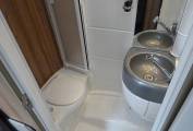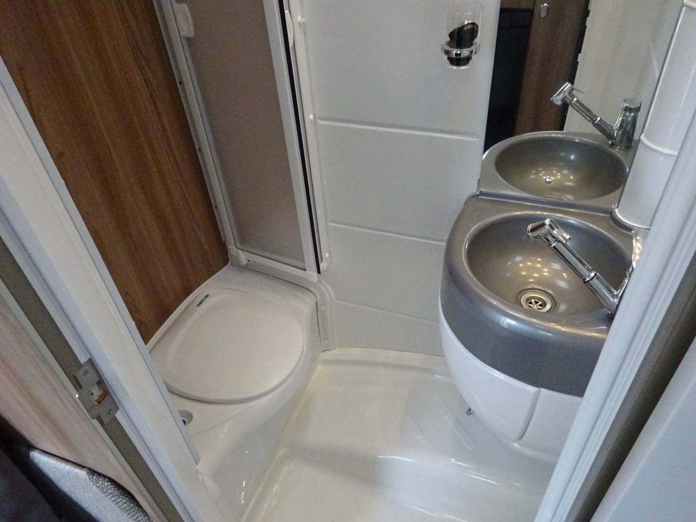 Central washroom with cassette toilet, vanity basin and shower with screen.