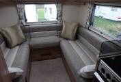 Front lounge diner area has double dinette seating with a table and a small side sofa to allow six to eat in comfort.