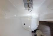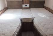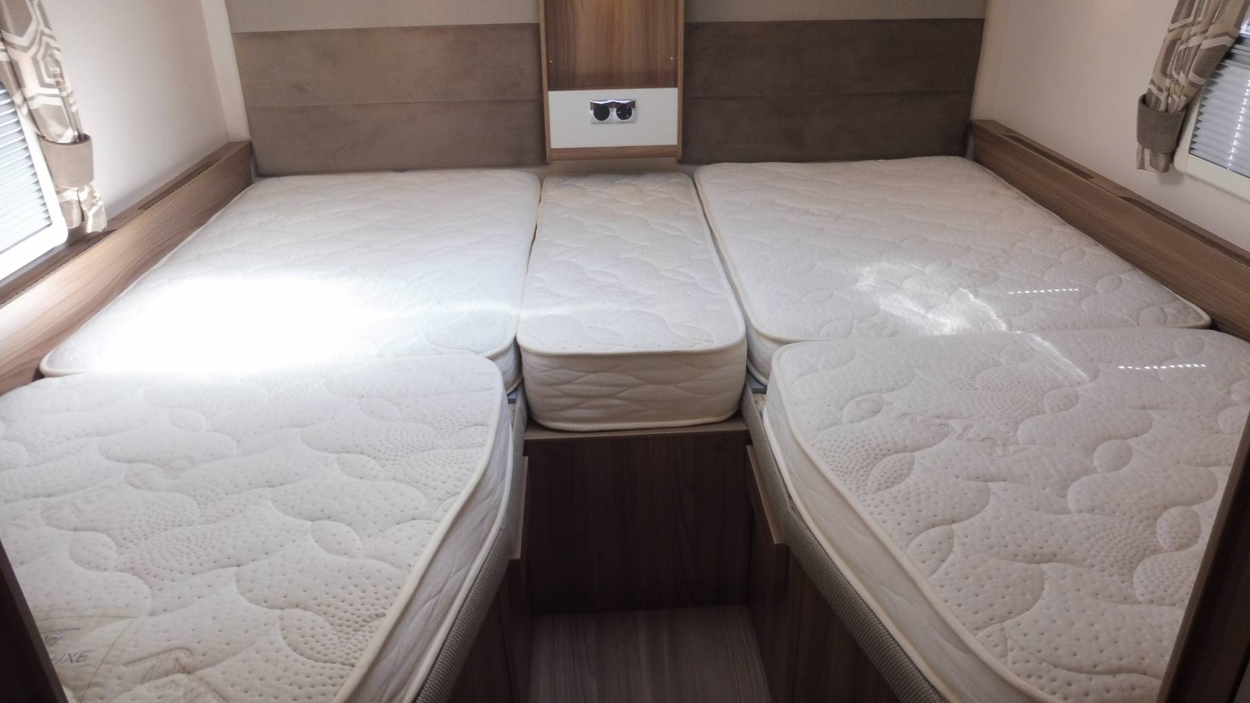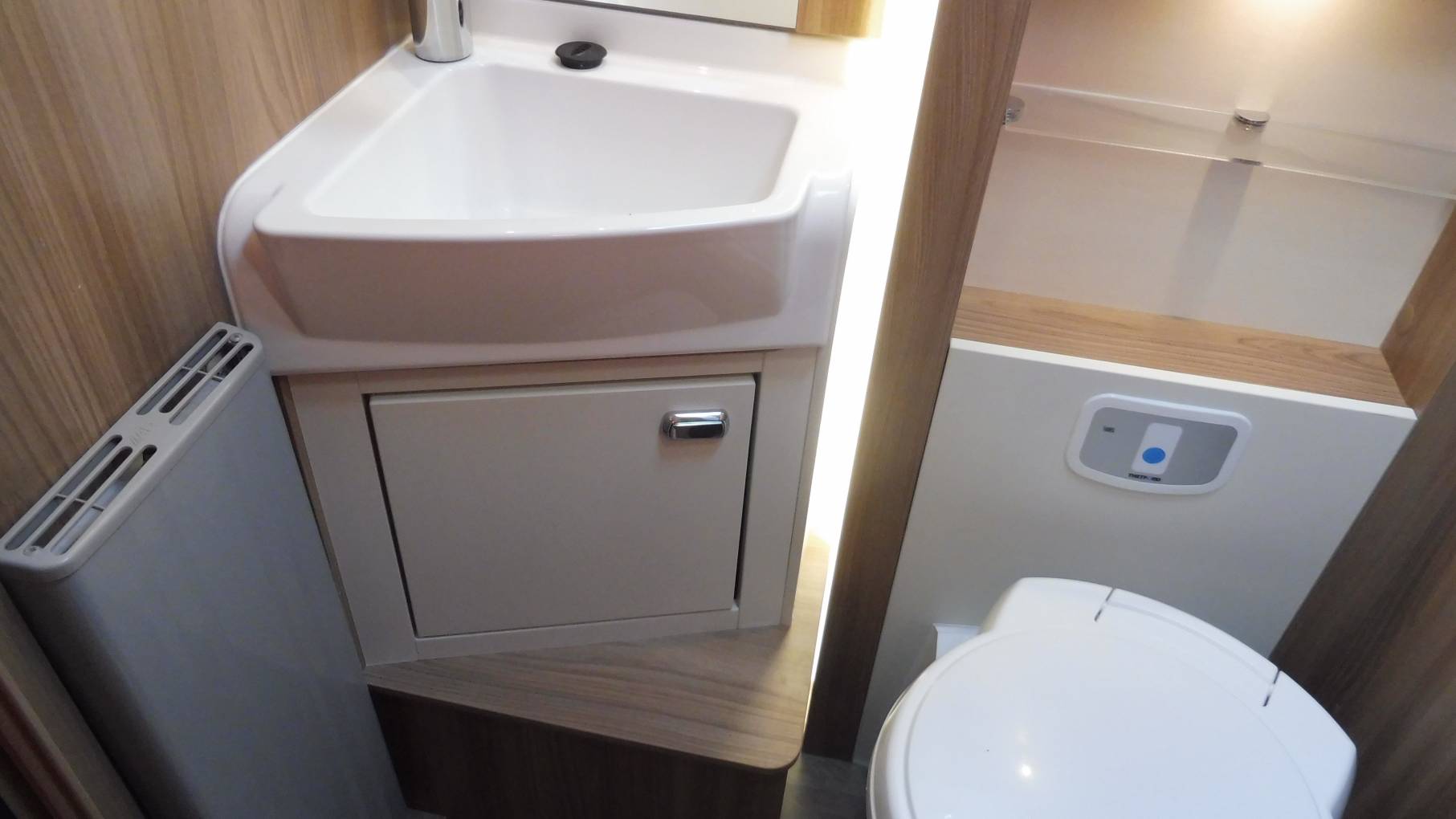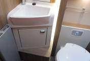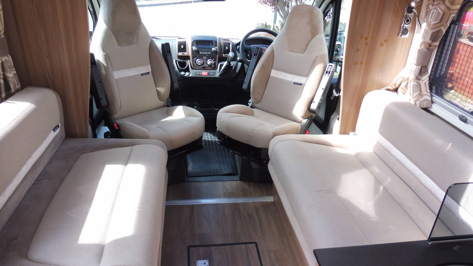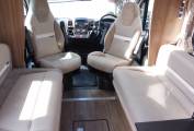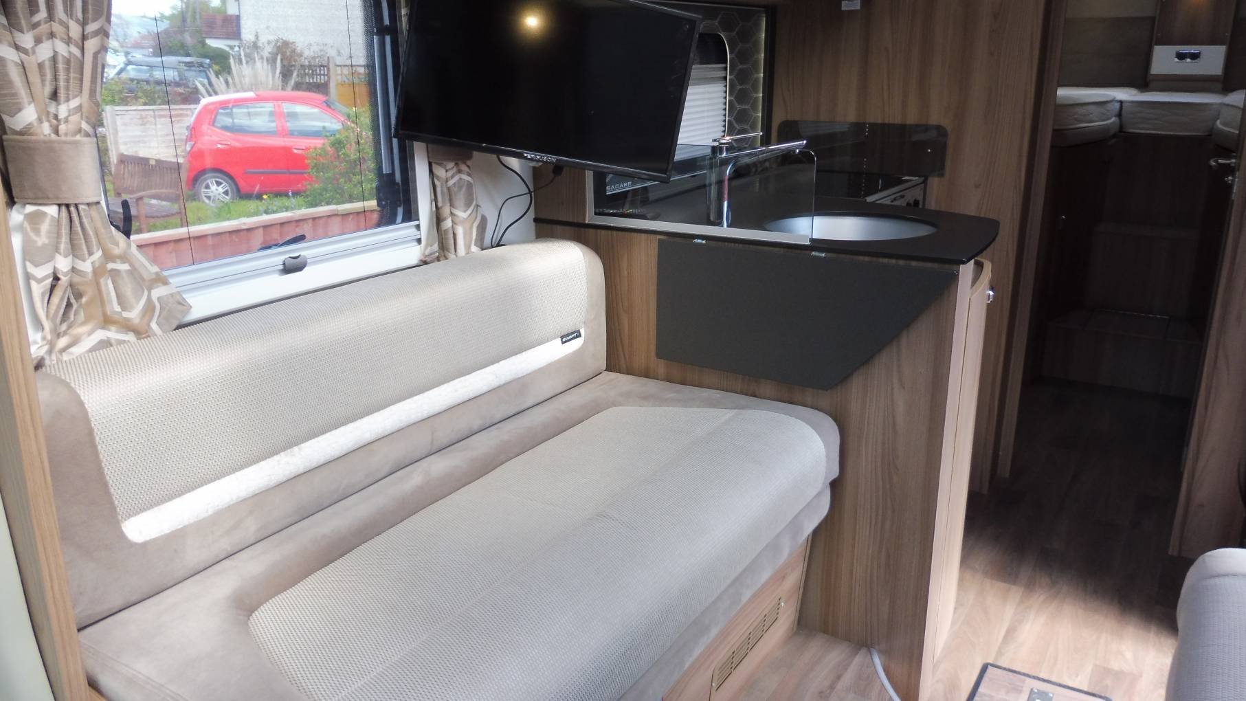 The rear of the motorhome, which can be partitioned off, houses high-level single beds which can be converted into a large double. There is a separate shower cubicle from the washroom with vanity sink unit and Thetford toilet. The front lounge area converts into a further double bed.