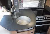 Arrive on site, swivel the captain-style chairs and kick back. The lounge is made up of opposing sofas with a portable table. Entertain six people in comfort, watch Satellite Television, a meal or just drinks. High-gloss cupboards, huge skylights and multiple lighting options add a touch of luxury to your camping experience. All round windows and the large overcab rooflight provides a light and airy space to while away your time.