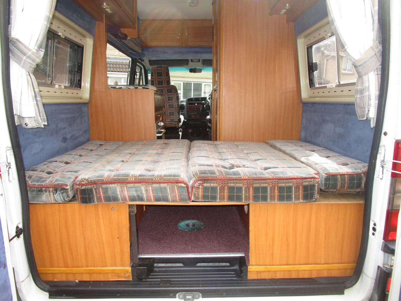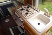 Compact and versatile, the layout consists of a rear lounge area which can also be accessed via the rear door and along with the removable table make a great dining area. This area also converts to the double bed. The kitchen is located to the centre of the camper and is well equipped with 3 burner gas hob, sink with hot and cold water, fridge with small freezer compartment, grill and separate oven. The washroom is adjacent the kitchen and provides an integrated shower, Thetford cassette toilet and drop-down wash basin. There is plenty of storage throughout the camper both at eye and floor level.