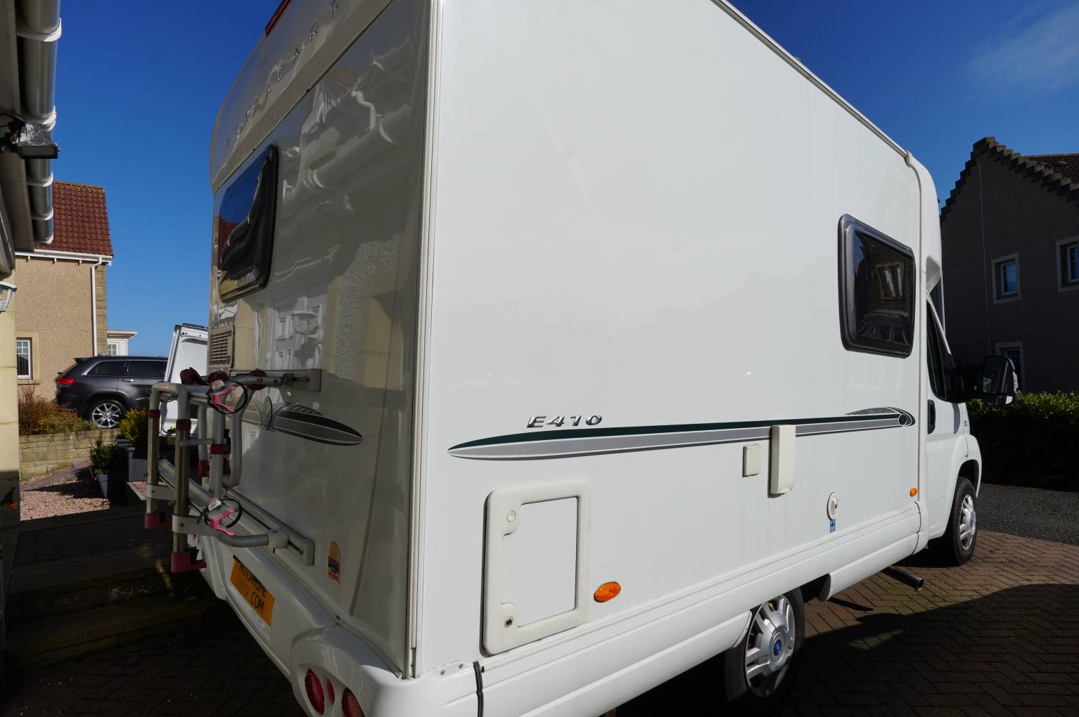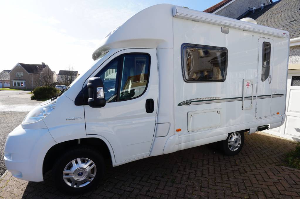 We have for sale a 2007 Bessacarr E410. Low-profile, 2-Berth, 2 Seatbelts, End Kitchen, motorhome that is in superb condition inside and out. Based on the 2.2Ltr Fiat Ducato engine with 5-speed manual gearbox. As you step in to the motorhome you will find the well specified end kitchen on the right which includes a hob with 3 gas and one electric plate, oven, grill, 3-way fridge with freezer compartment, microwave, sink with mixer tap and ample storage. Adjacent to the kitchen is the washroom with shower, hand basin with mixer tap, Thetford cassette toilet with electric flush, vanity mirror and storage locker. As you move forward you will find a large wardrobe with heater below and opposite is a smaller cupboard with a large worktop that could be used as a prep area for food and/or a TV. You will find a 240V and 12V socket and aerial point available. The lounge/dining area consists of two comfortable settees and both Captains seats swivel into the area. The settees make a large double bed or could be made up as two singles using the two swivels seats. There is gas/electric blown air heating and water heater. Other features include an electric entrance step, Fiamma roll-out awning, bike rack, 2 x gas bottles, Remis Cab blinds and fly/blinds on all windows in the rear.