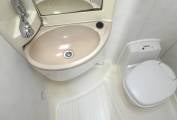 The well proportioned washroom, has toilet, sink and shower attachment.