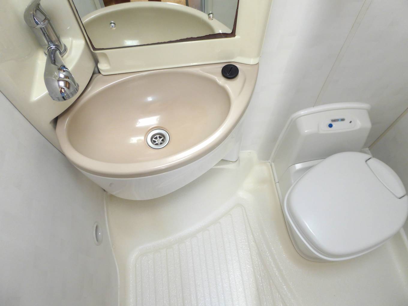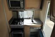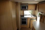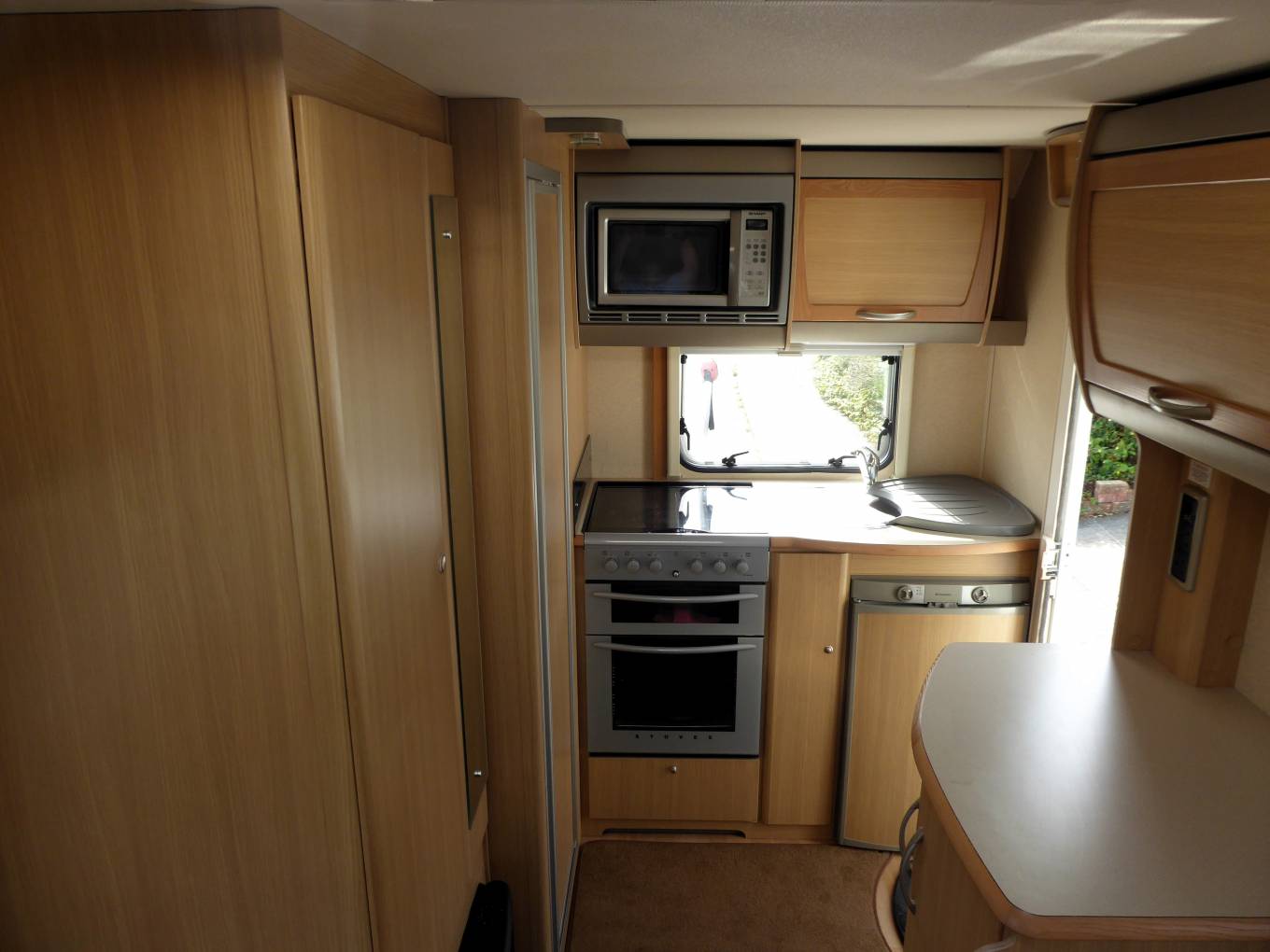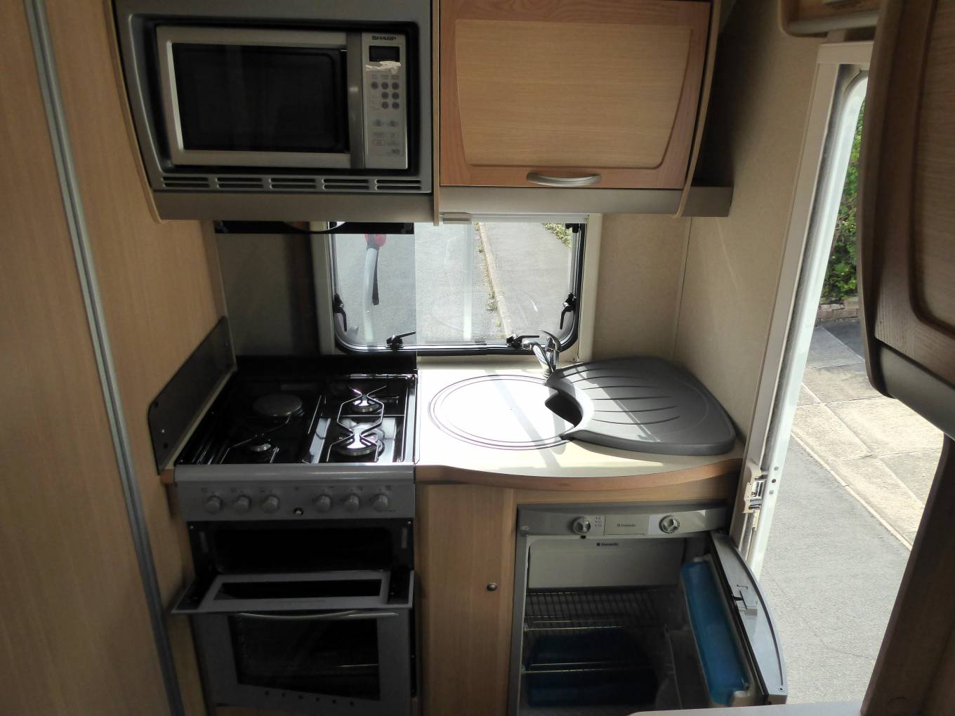 The kitchen at the rear, comprises a cooker, with oven, grill, 3 gas burners and electric hob plus fridge, sink and microwave. There is good worktop space and storage forward of the habitation door.