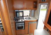 Using the electric step, enter the van and the kitchen is immediately on your right, with a round stainless steel sink and chrome mixer tap, a four gas burner hob with glass lid, gas grill and oven beneath. There is a Dometic 3-way powered fridge with freezer box, plenty of preparation worktop space and upper and lower cabinets to store away all of your holiday provisions.