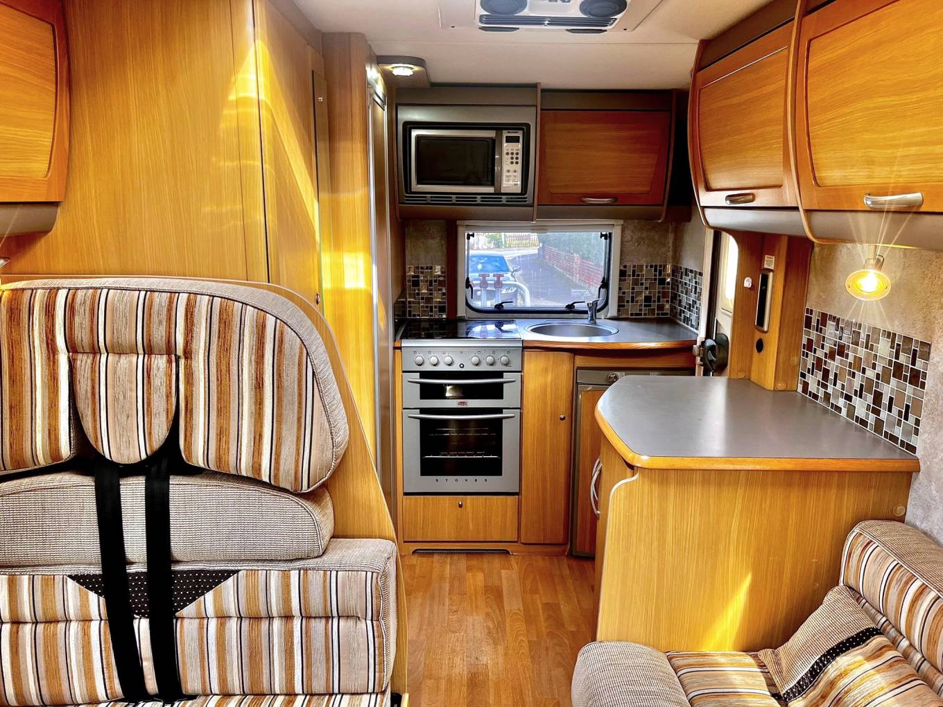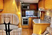 Stepping inside the motorhome from the rear you will find the kitchen which comes equipped with a full size oven, 3 burner gas hob, electric hotplate, microwave, fridge as well as plenty of storage cupboards to accommodate all the equipment you need. And as it is located by the habitation door, with a skylight and a window above the sink, it all makes this a light, bright space with excellent ventilation.