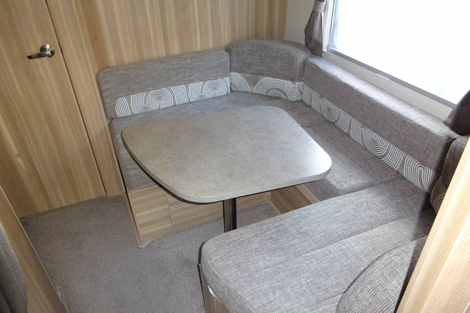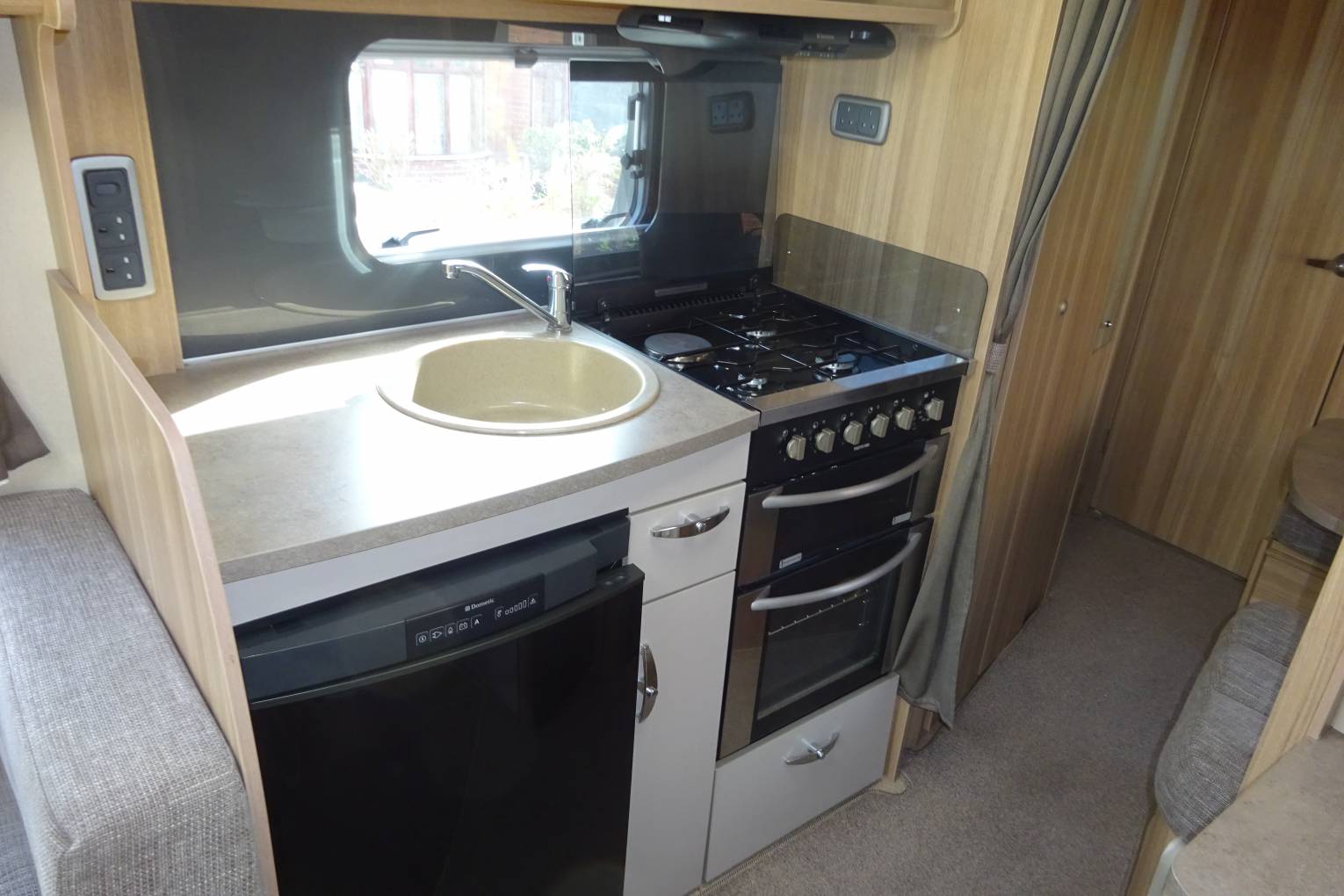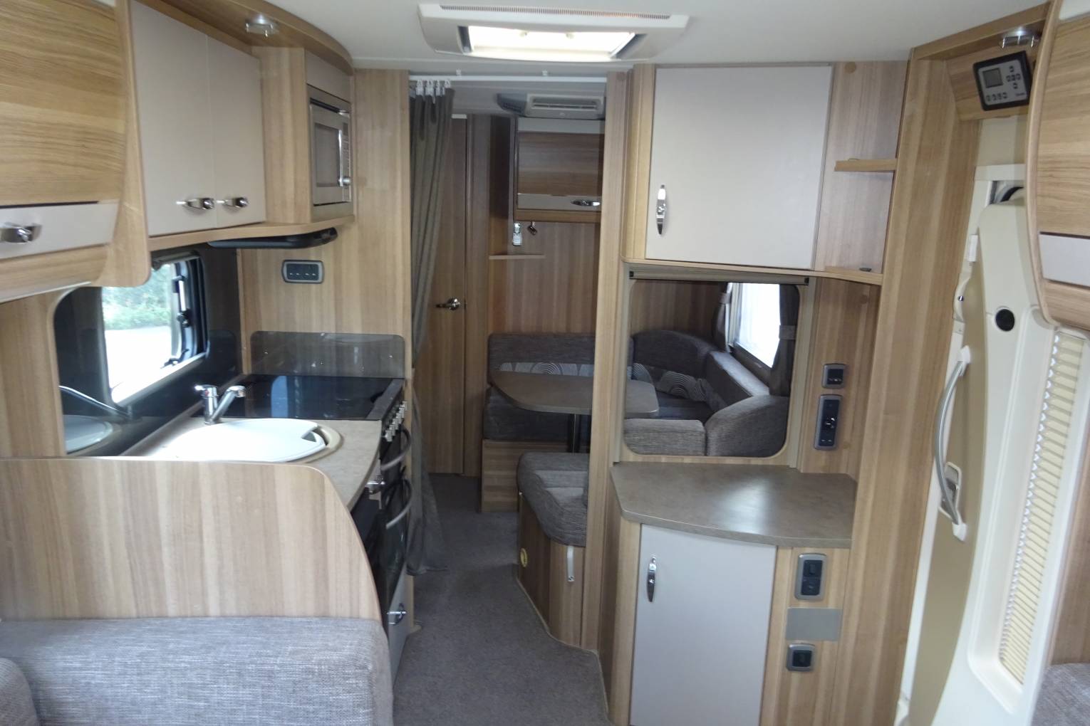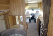 As you step inside you get a real feel for the spaciousness and luxuriousness of this motorhome. You immediately notice that the inside is as well presented as the exterior of this motorhome. At the front of the motorhome there are two benches and two captains chairs making a seating area big enough for 6. The seating area easily makes up in to a good size double bed. You then come to a very nice, well equipped kitchen, fitted out with an oven, grill, 3 burner gas hob complimented with a fourth electric ring, microwave, sink and a large fridge with ice box. There are plenty of storage cupboards and compartments throughout the living and kitchen areas allowing you to bring everything you might need. Towards the back of the motorhome there is a second large seating area that breaks down in to a double bed. There is the option to make this seating area in to a fixed bed with the mattress provided. Please note that this is only really an option before you set off on a journey. At the rear of the motorhome is a large bathroom equipped with sink, toilet and a separate shower cubicle.