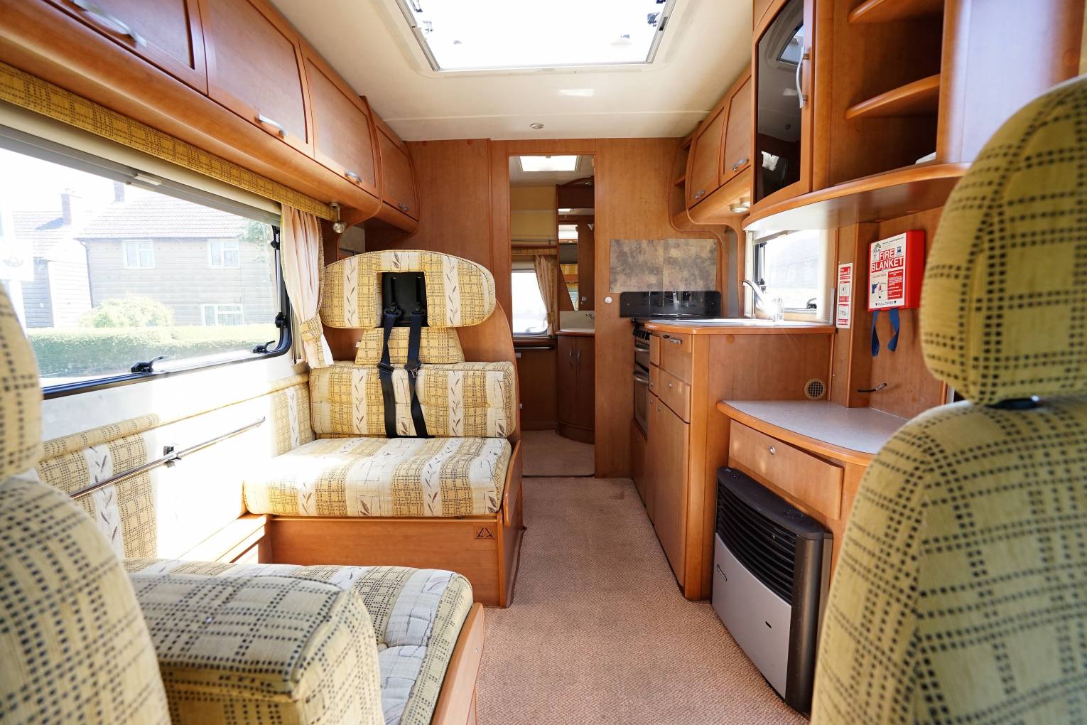 of a spacious 4 seater dinette with removable table and 2 rear seat belts. This converts to a second double bed (1.87m x 1.20m). Drinks cabinet with TV point underneath, gas fire. Passenger seat swivels into