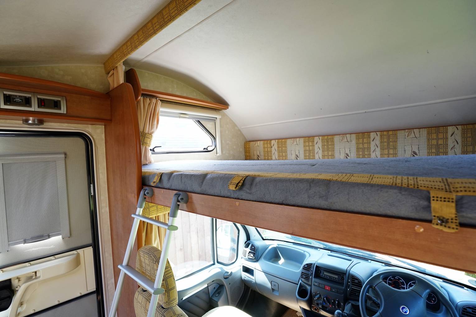 double bed (2.09m x 1.35M) with window either side and luton ladder. This slides back to provide