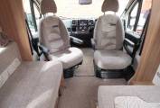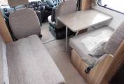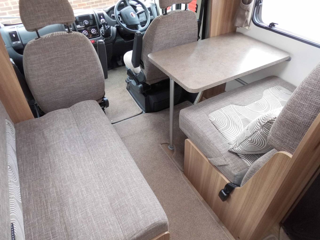 Next to the bedroom is the very elegant bathroom featuring a separate shower with a screen, a Thetford flush toilet, a wash basin with mixer tap, a mirror and generous cupboard space to store your toiletries. As you exit the bathroom you come to the centrally located kitchen which has everything a budding chef needs to rustle up a culinary delight. There is a microwave, an oven and grill, a dual fuel hob with 3 gas burners and an electric hotplate, a 3 way 110 litre Dometic fridge freezer with auto setting, a sink with mixer tap and lots of cupboard space to store utensils and ingredients. A skylight above the kitchen provides plenty of natural light to prepare your food.