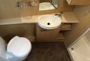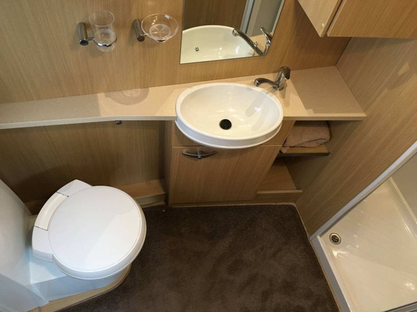 with a chrome mixer tap, a Thetford cassette swivelling toilet and a medicine