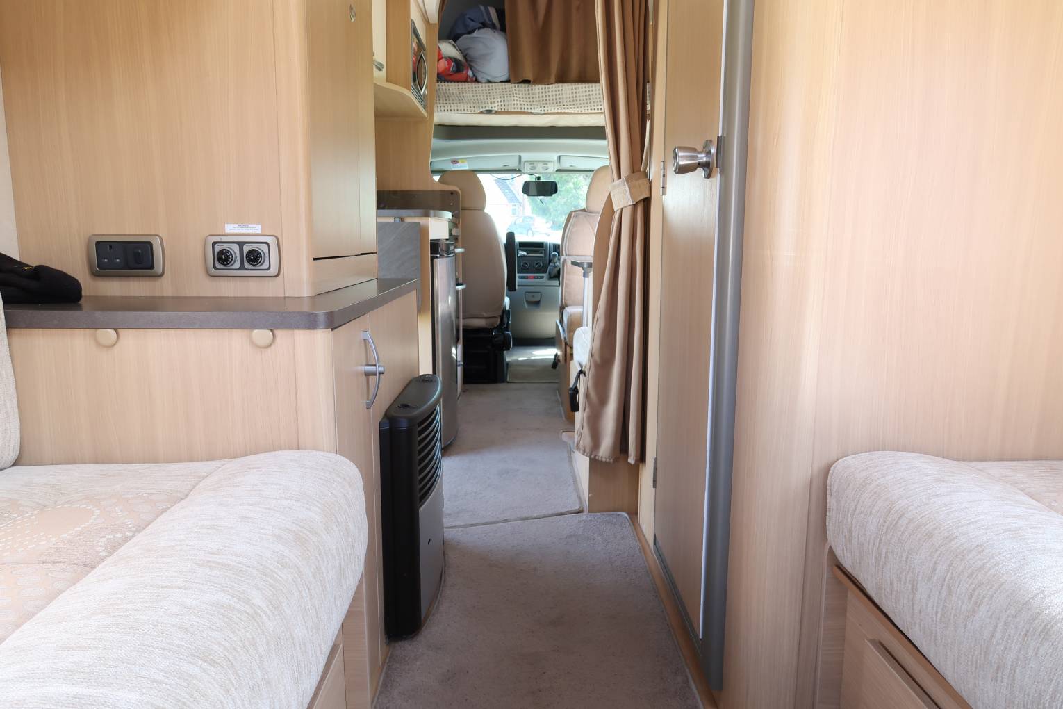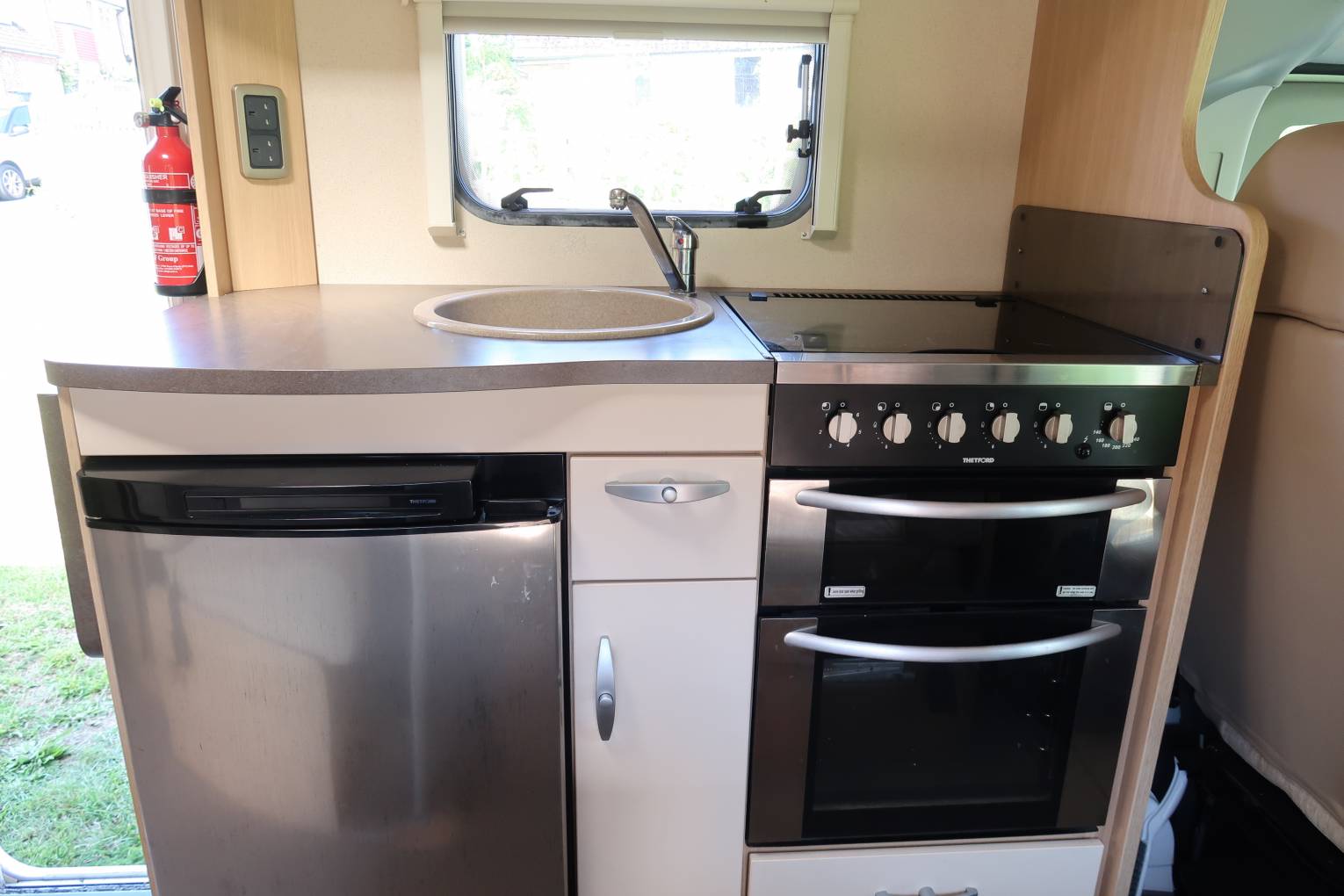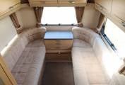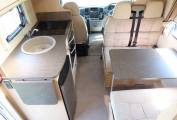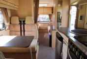 Behind the driver cab you have the kitchen on the nearside and the lounge dinette on the offside. The kitchen is equipped with a dual-fuel hob with an electric hotplate and 3 gas burner hob, a microwave, a 3-way fridge with ice box and a stainless steel sink with a mixer tap. Opposite in the lounge dinette you have forward and rear facing 2 seater sofas fitted with 2 seat belts on each sofa so 6 people can travel safely. At bedtime the lounge dinette converts into a double bed.