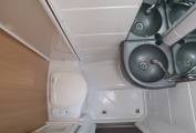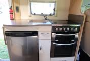 The washroom has everything you need to keep yourself clean and fresh on your travels including a shower with the showerhead built into the mixer tap, a wash basin and a Thetford cassette toilet. There is a bathroom storage cupboard for your toiletries, a good size mirror and a skylight throws in plenty of light. There is also a swing wall that simply unclips and rotates round to create a separate showering area which is quite ingenious.