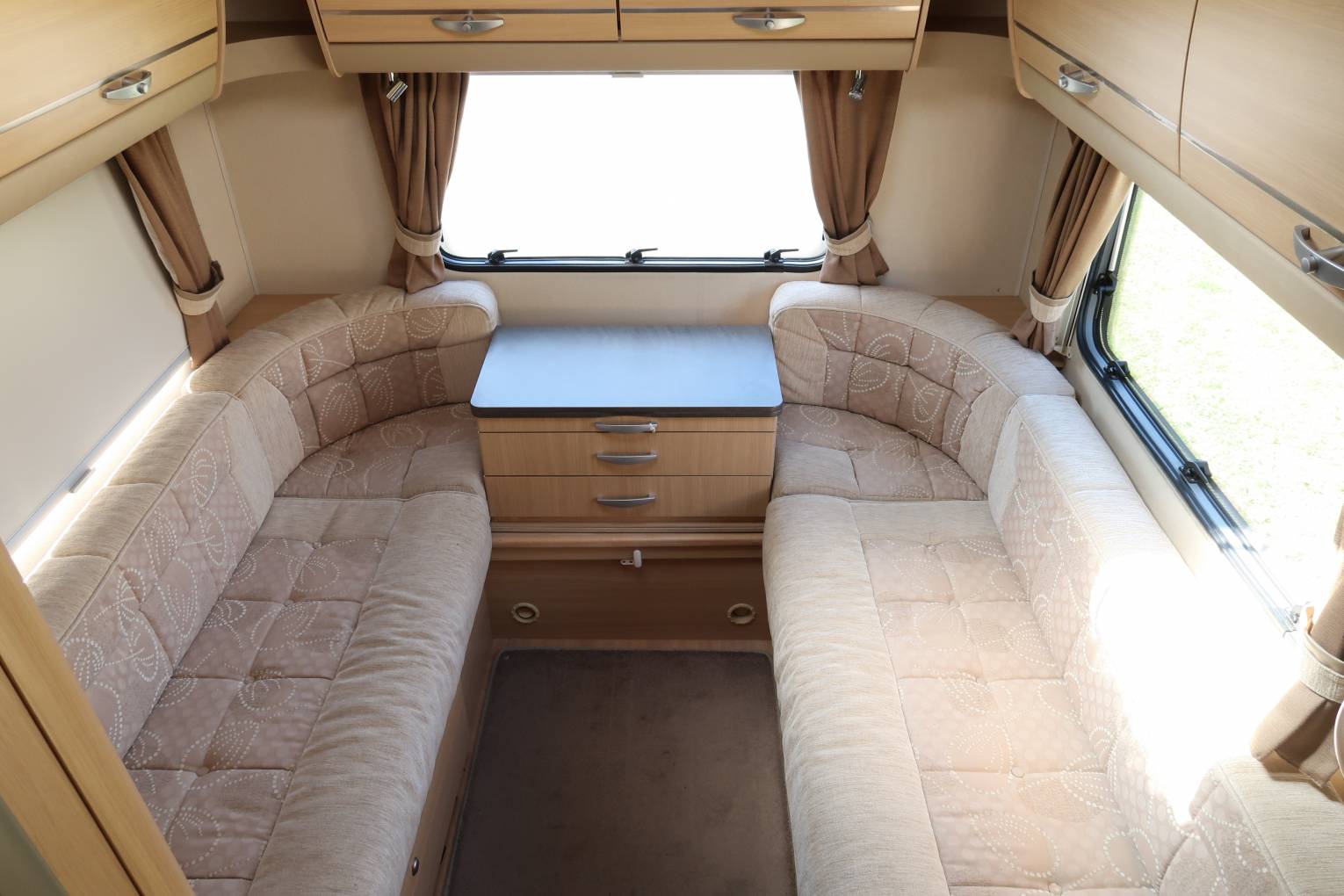 Probably the standout feature of this desirable motorhome is the gorgeous light and airy rear U-shape lounge. Here you have two side facing sofas finished in a lovely fabric that is in very good condition and inbetween these are some drawers with a flip top table which can be used for dining or as a drinks table. At bedtime the two sofas pull together to create a kingsize bed or alternatively the two sofas can be used as single beds.
