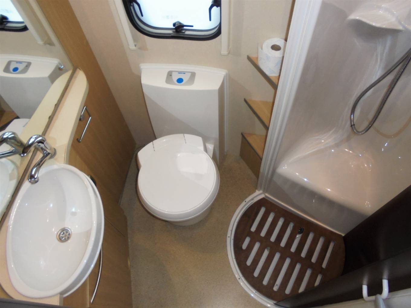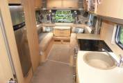 Kitchen area has ample worktop space, sink, hob with 3x gas rings and 1x electric ring, separate oven and grill, a large Thetford 3-way fridge with separate freezer compartment. Heating and hot water are provided by a Truma system on gas or electric. There is a standalone dining table for the lounge. Washroom has Thetford cassette toilet, separate shower cubicle and a sink unit. This motorhome has a directional TV aerial, TV bracket and TV points, rear speakers, loose fit carpets and window blinds throughout. Other features include swivel cab seats, cruise control, cab air con and a reversing camera. Lots of internal and external storage space.