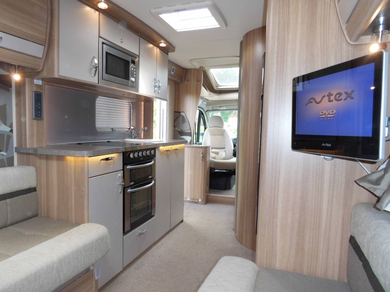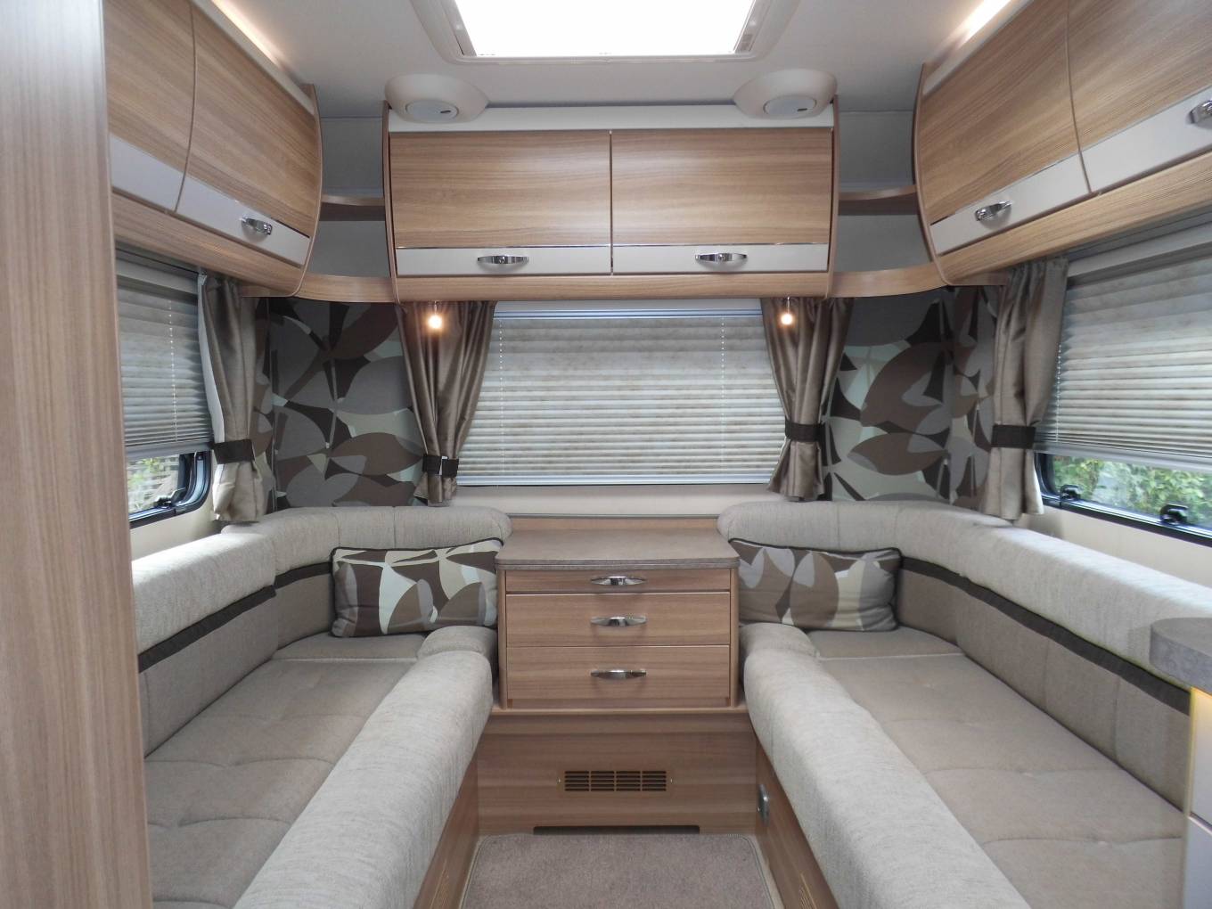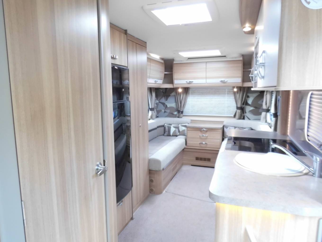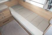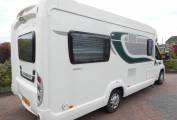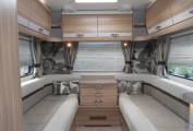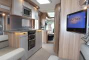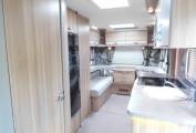 Outside there is a Fiamma 45S recessed awning, dual aspect reversing camera, gas locker including two gas bottles, ABS and EBD vehicle braking systems, winter pack option fitted for all year round use, 34mm sandwich construction GRP roof, side storage pannier locker, detachable towbar, access to toilet cassette and a mains hook up point.