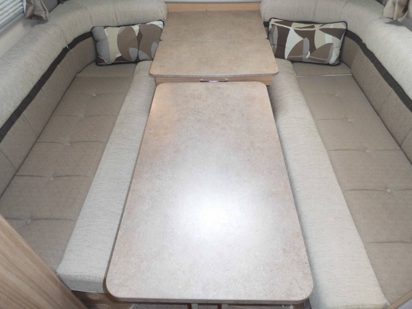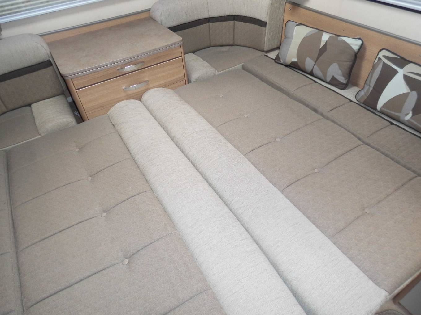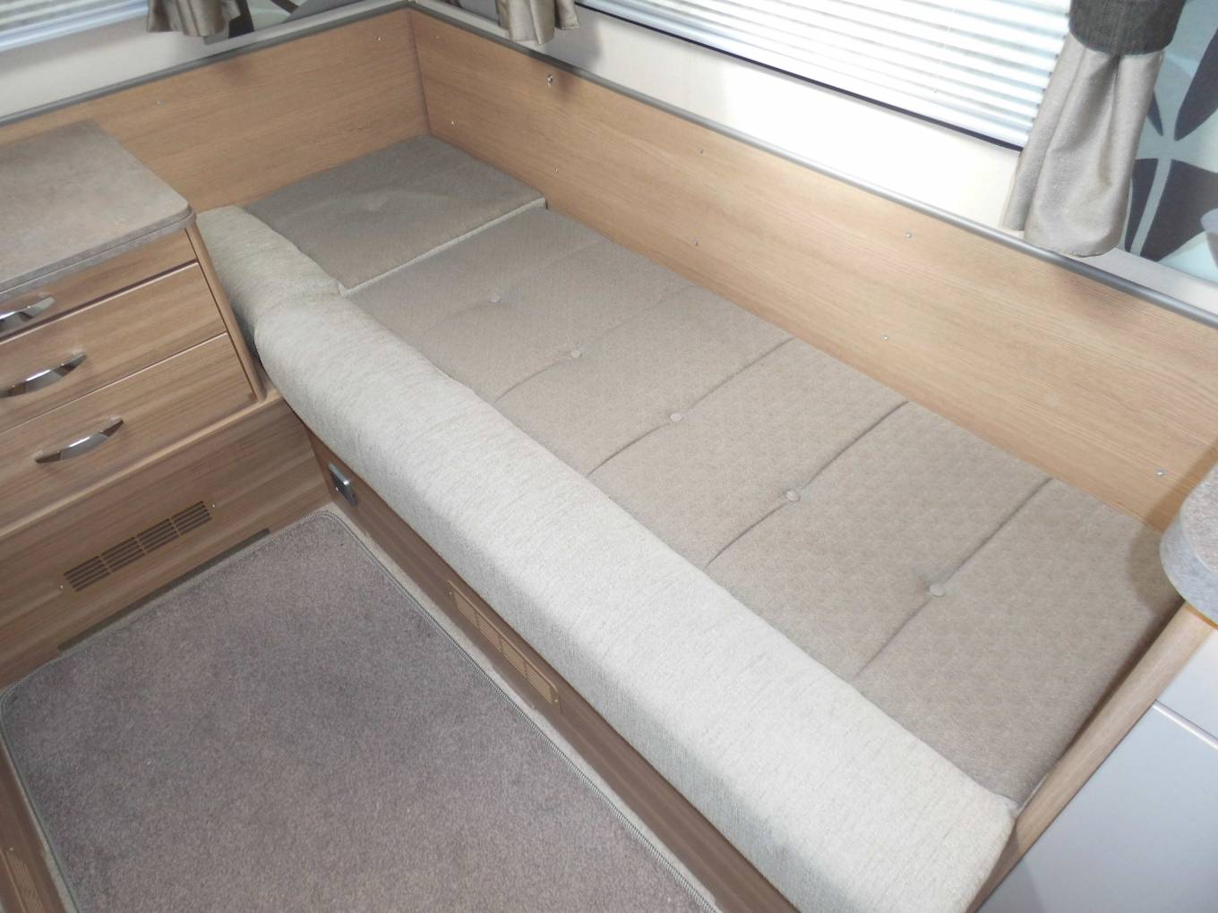 Outside there is a Fiamma 45S recessed awning, dual aspect reversing camera, gas locker including two gas bottles, ABS and EBD vehicle braking systems, winter pack option fitted for all year round use, 34mm sandwich construction GRP roof, side storage pannier locker, detachable towbar, access to toilet cassette and a mains hook up point.