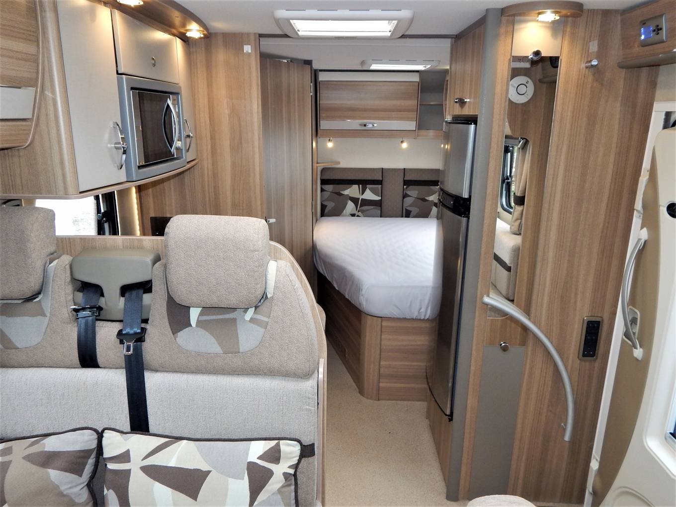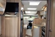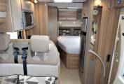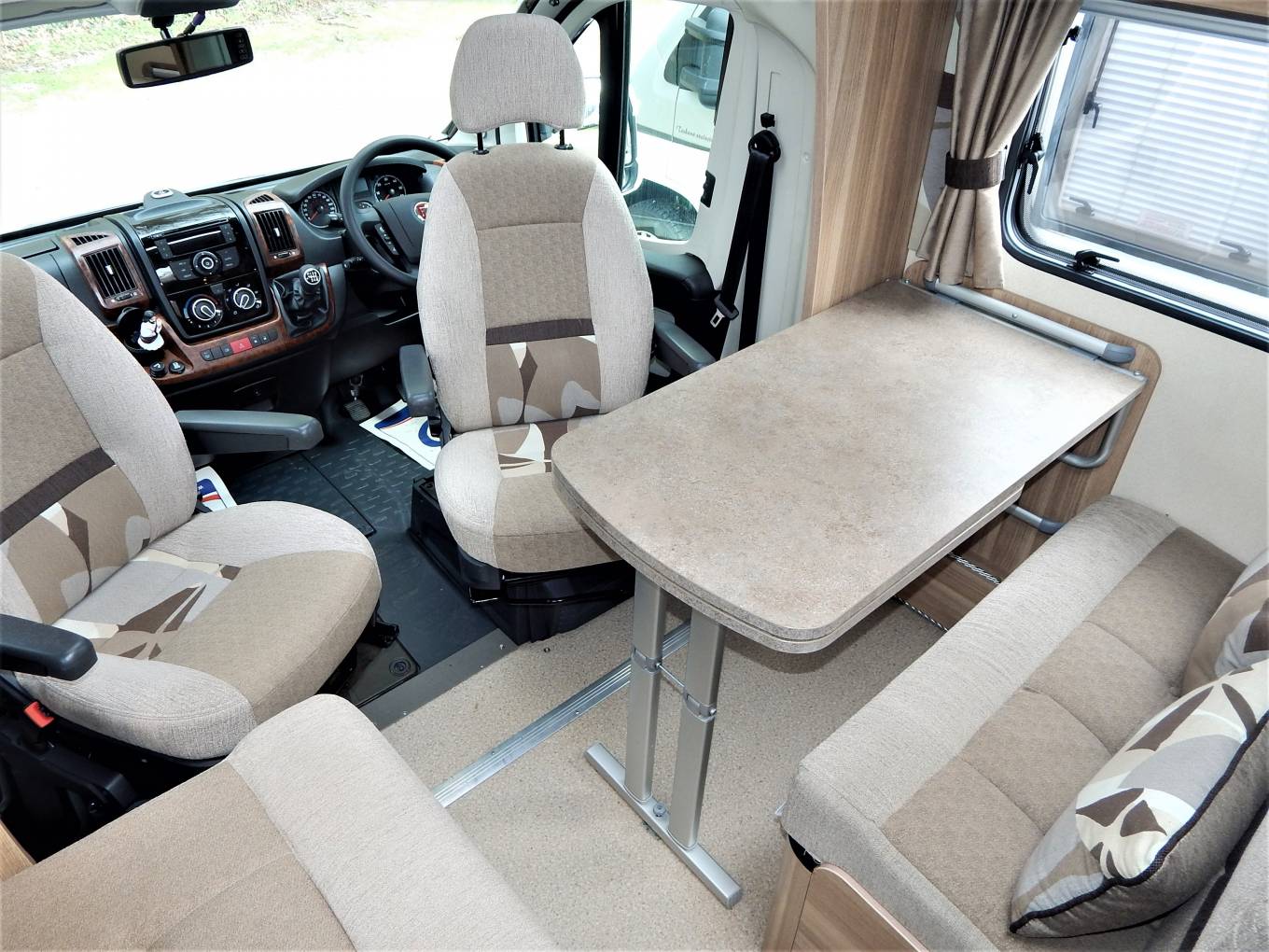 We enter the motorhome on the nearside via a low step immediately to the left is the dinette which consists a side sofa facing a fixed table with an additional forward facing sofa with 2 x 3 point lap & diagonal seat belts for travelling guests. The front chairs also rotate to join this area so you could comfortably seat 6 if entertaining on site. The second double bed is also made up by lowering the table and using a combination of cushions as the mattress.