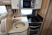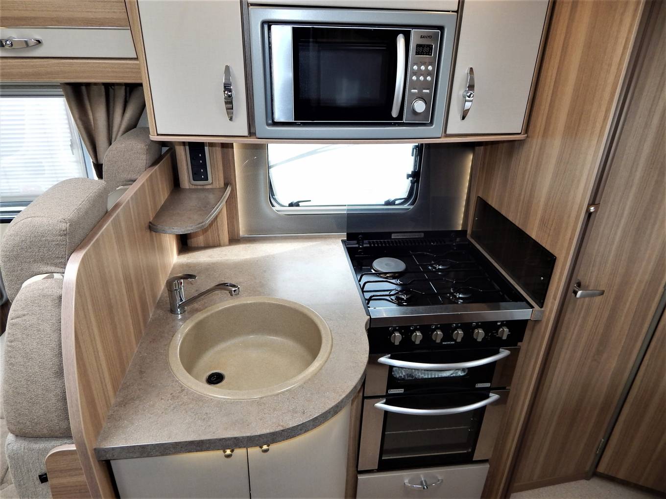 The Kitchen opposite the Habitation door consists of a round cream sink bowl with chrome mixer tap, also a black enamel 4 burner hob, 3 gas and one 240v hotplate for when you are plugged in on site. Above there is a Sanyo Microwave and plenty of cupboard space for all you cooking utensils. Below the counter is a full size Thetford Oven with grill. Opposite a large Thetford absorber style fridge with separate freezer box, this is fully automatic and changes to the preferential power source whether its 240v, 12v or gas depending whether you are on the move or wild camping