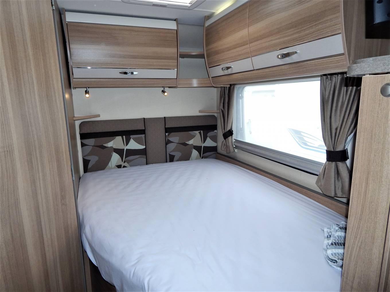 Moving rear on the rear passenger side is the main French bed which lifts to access storage below, and the bathroom to the side is combined with the shower room, but splits front to back via a perspex screens to keep the toilette area dry while in use. The toilette is a fresh flush Thetford swivel top. The sink is a pedestal style white oval bowl with a chrome mixer tap, cupboard below. At the foot of the Bed there is a TV point with large flat screen TV, that can be used while in bed or flipped round to view while in the lounge.
